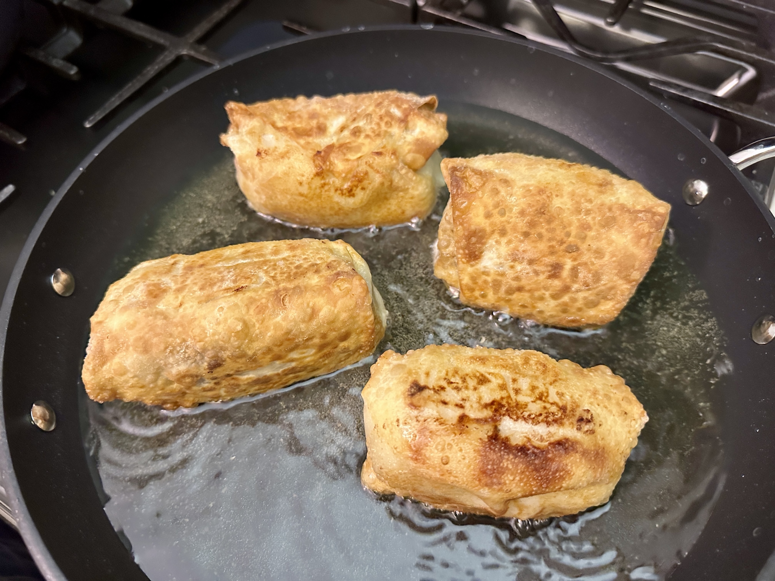 Heat the oil in a shallow fry pan. Once hot, add the egg roll(s) and fry until crispy, about 8-10 minutes. Make sure to rotate every few minutes to crisp all sides and heat the ingredients but don’t overcrowd the pan. Only add 2-4 egg rolls at a time, depending on how big the egg rolls and pan are.