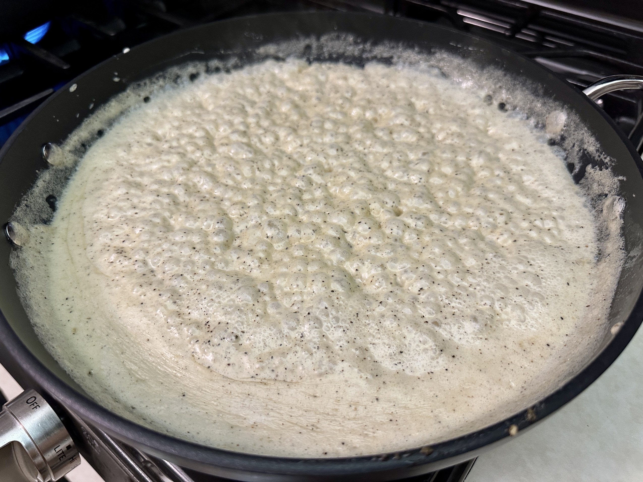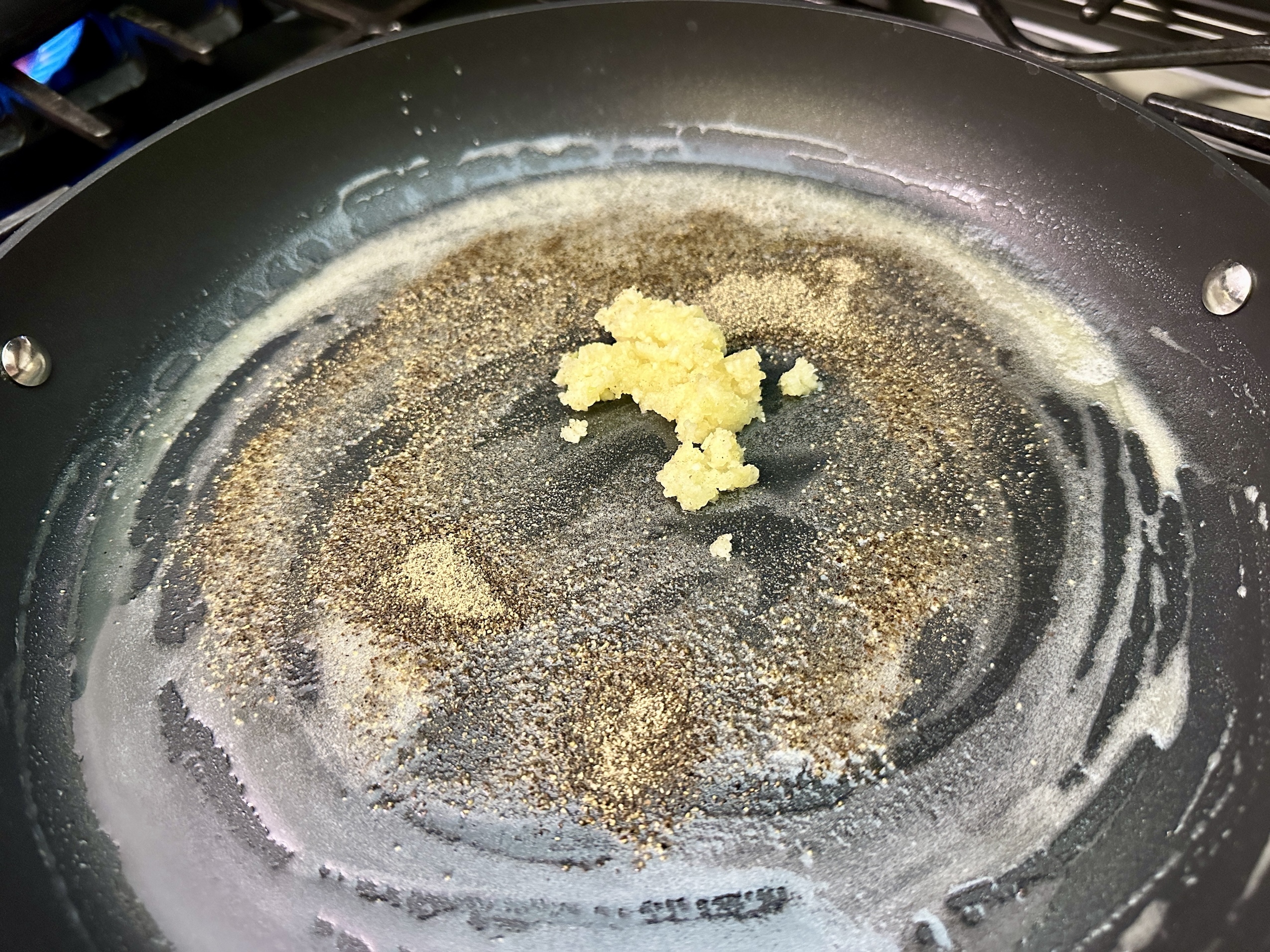 Use a large skillet to melt 1 Tbsp of butter over medium heat. Add the garlic and pepper and cook for 1-2 minutes then whisk in the cream.