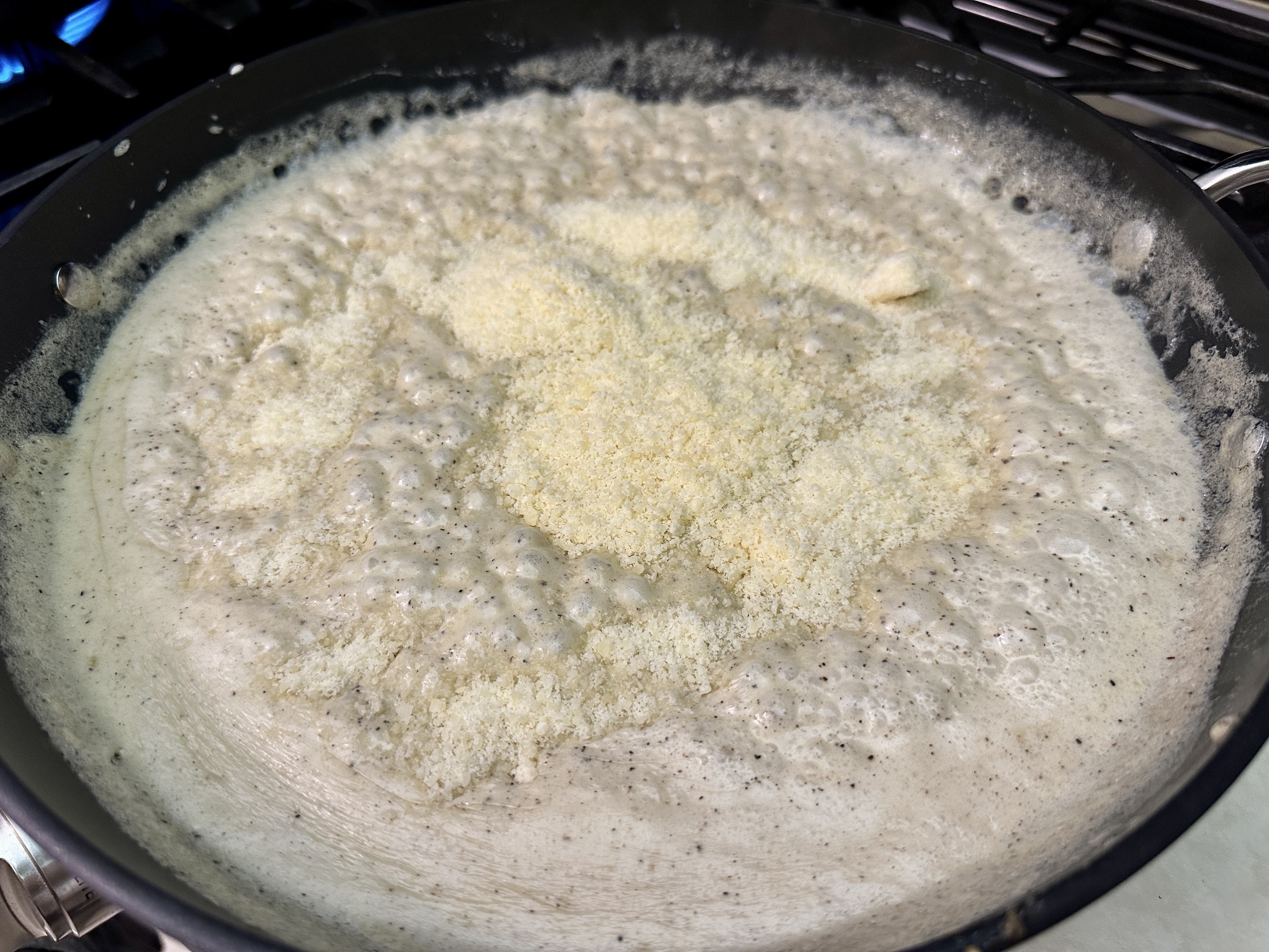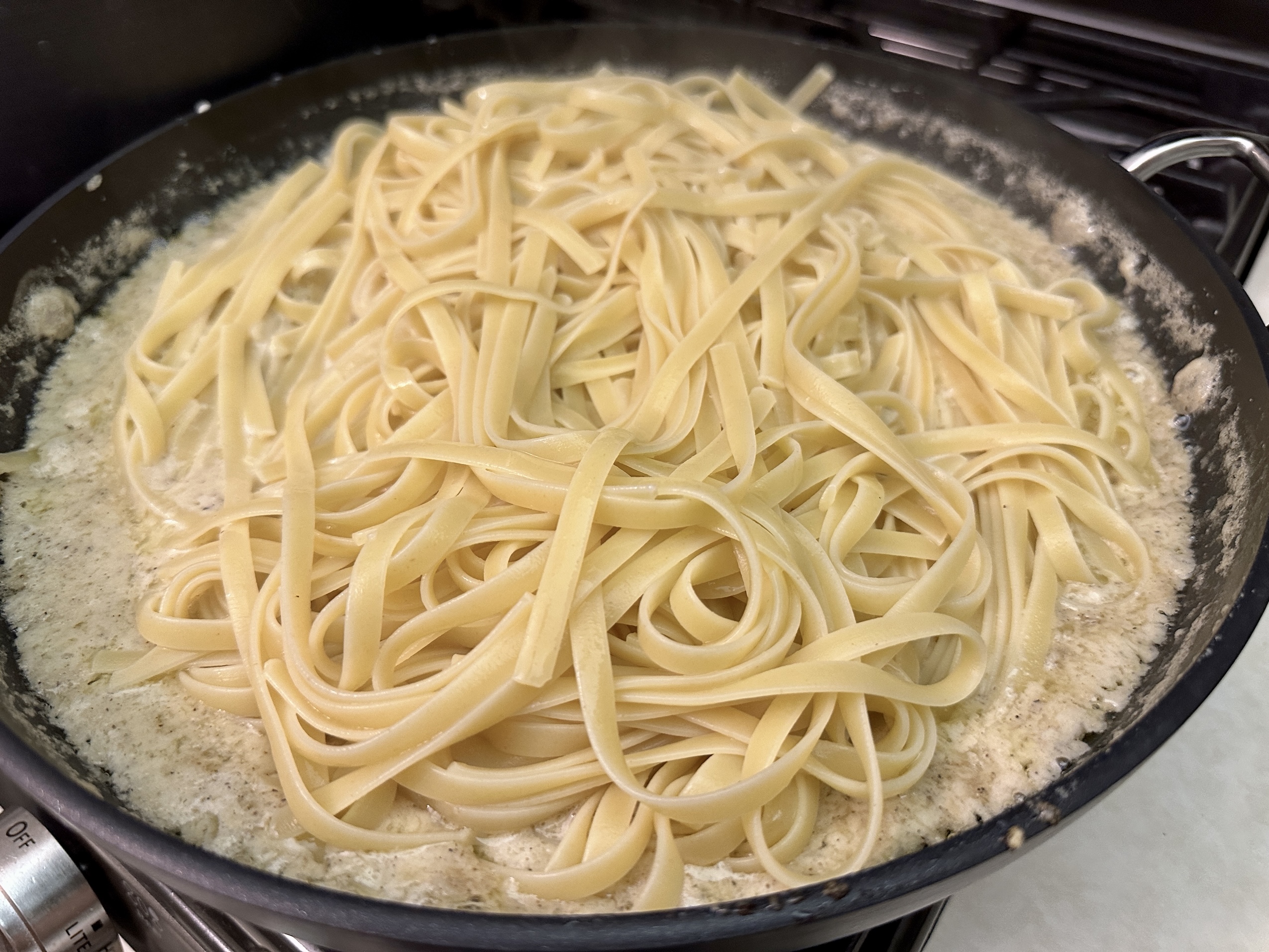 Add the parmesan and stir until melted then add the noodles and toss to coat.