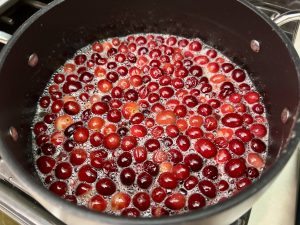 While the turkey bakes, start the cranberry sauce. Add the cranberries, orange juice, and honey to a saucepan. Bring to a boil then reduce the heat to simmer for 10-15 minutes, letting the cranberries burst.
