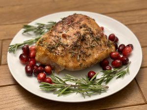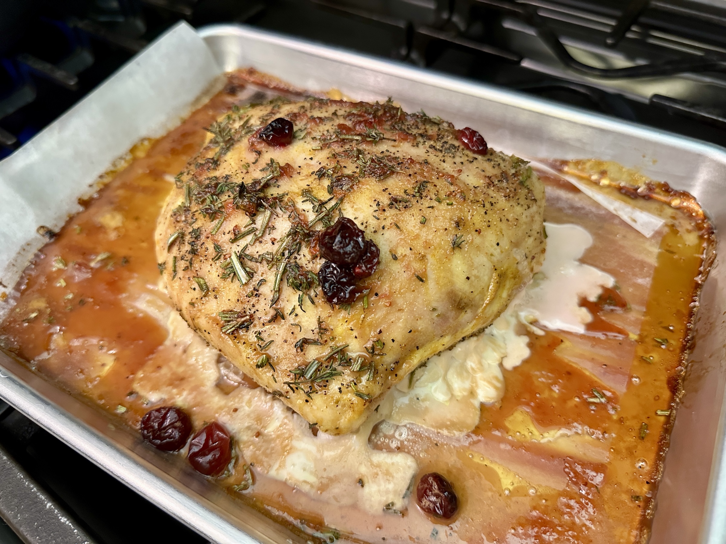 After 30 minutes, liberally baste the turkey breast with the cranberry sauce, then cook for an additional 30 minutes, baste again, and cook for the final 30 minutes. The internal temperature should be 165 degrees F. Bake longer if needed. When ready, remove from the oven, baste one final time, and let sit for about 10 minutes to let the juices redistribute.