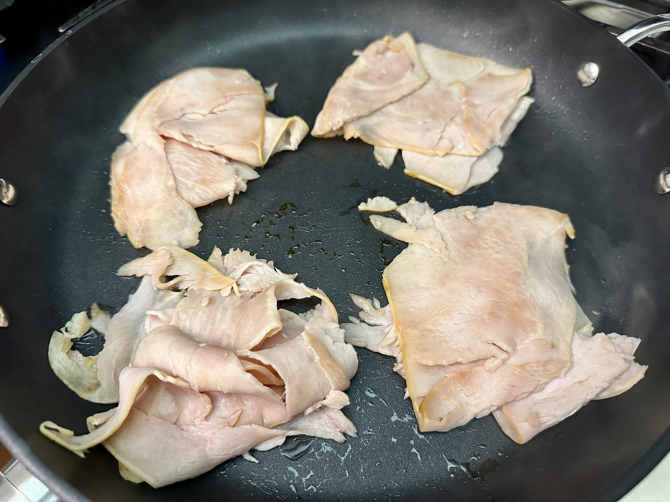Heat a griddle pan over medium-low heat. Add the turkey, ensuring to portion it into 4 equal sized piles. Heat the turkey until warmed through, about 2 minutes per side.