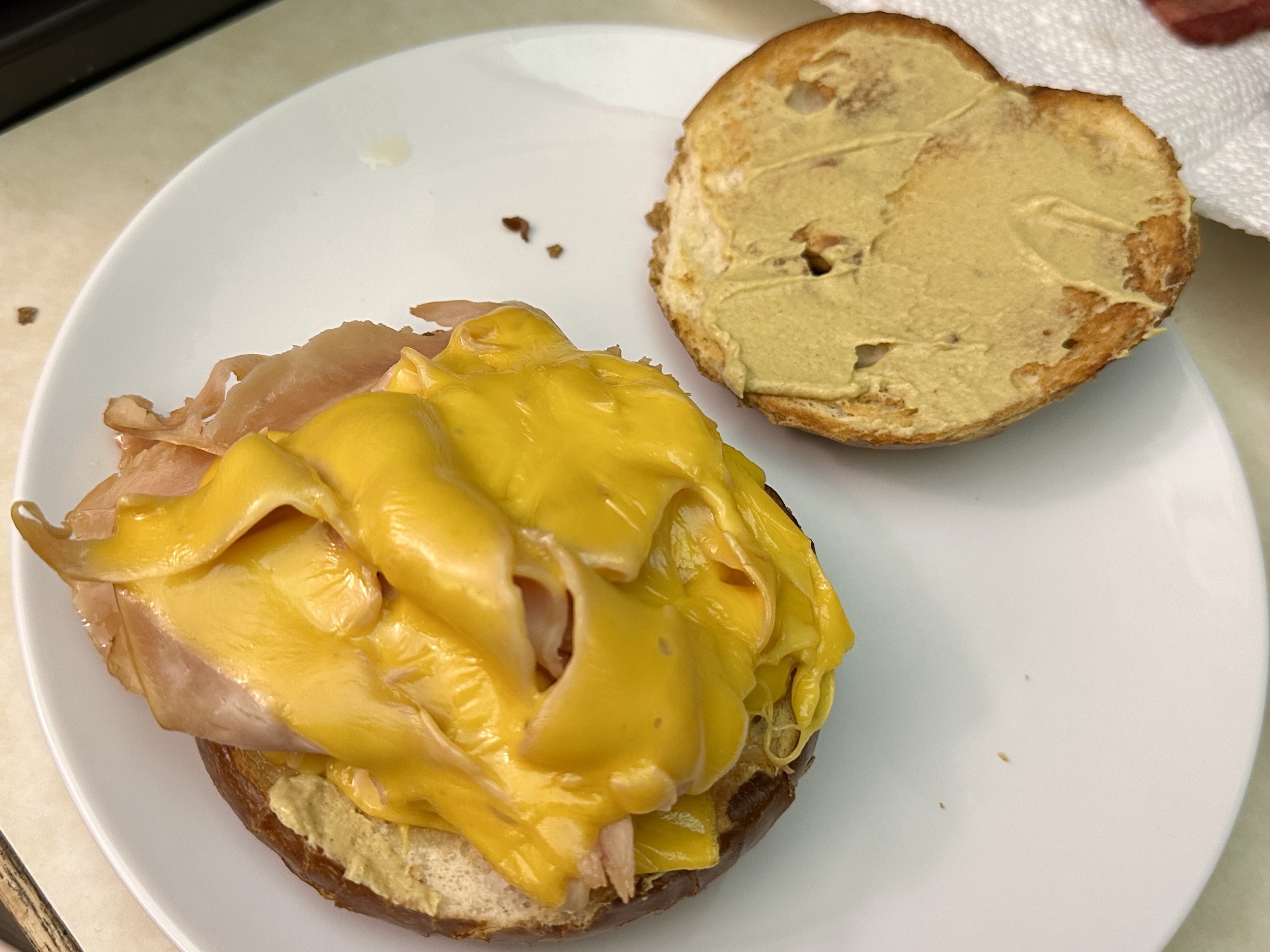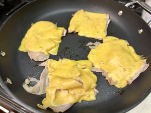 Add a slice of cheese to each turkey pile and continue to warm until melted.