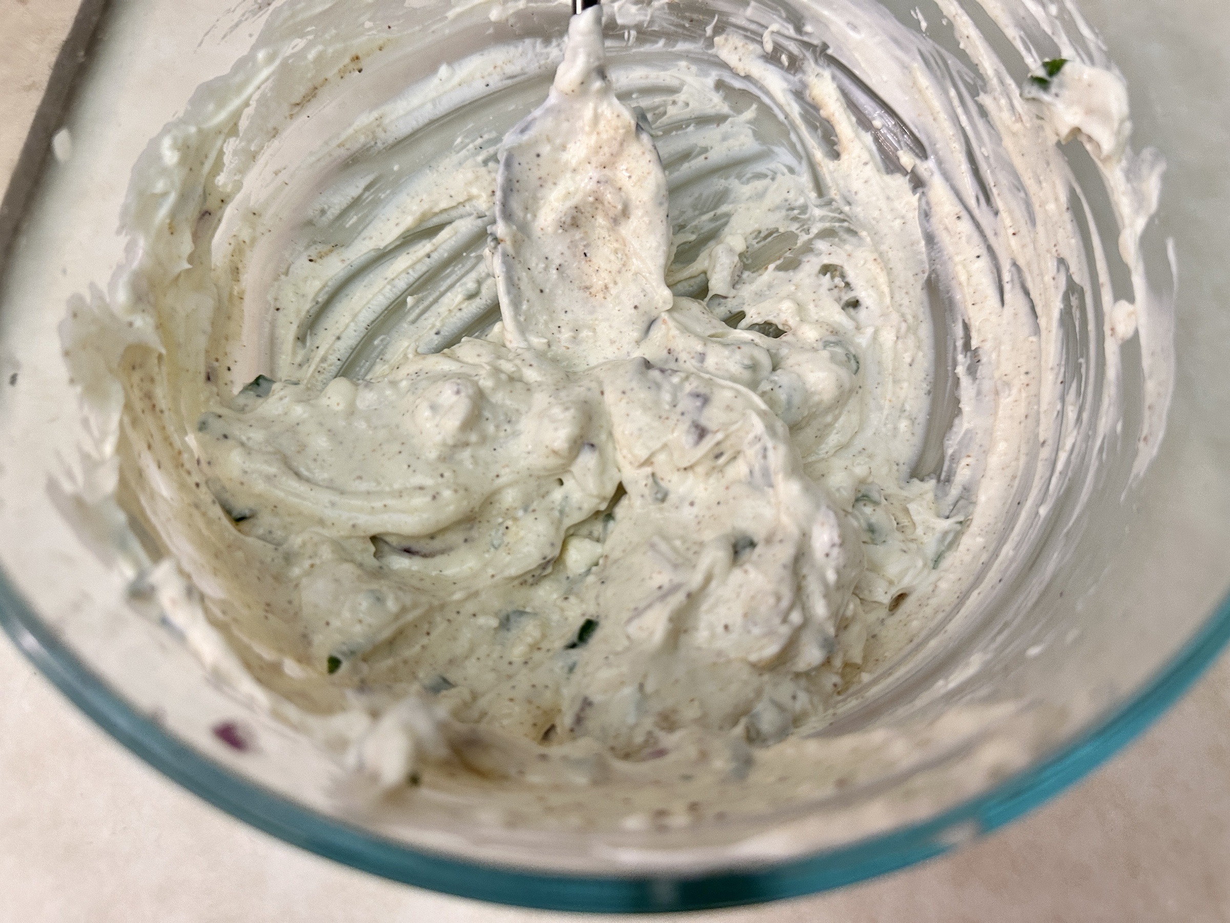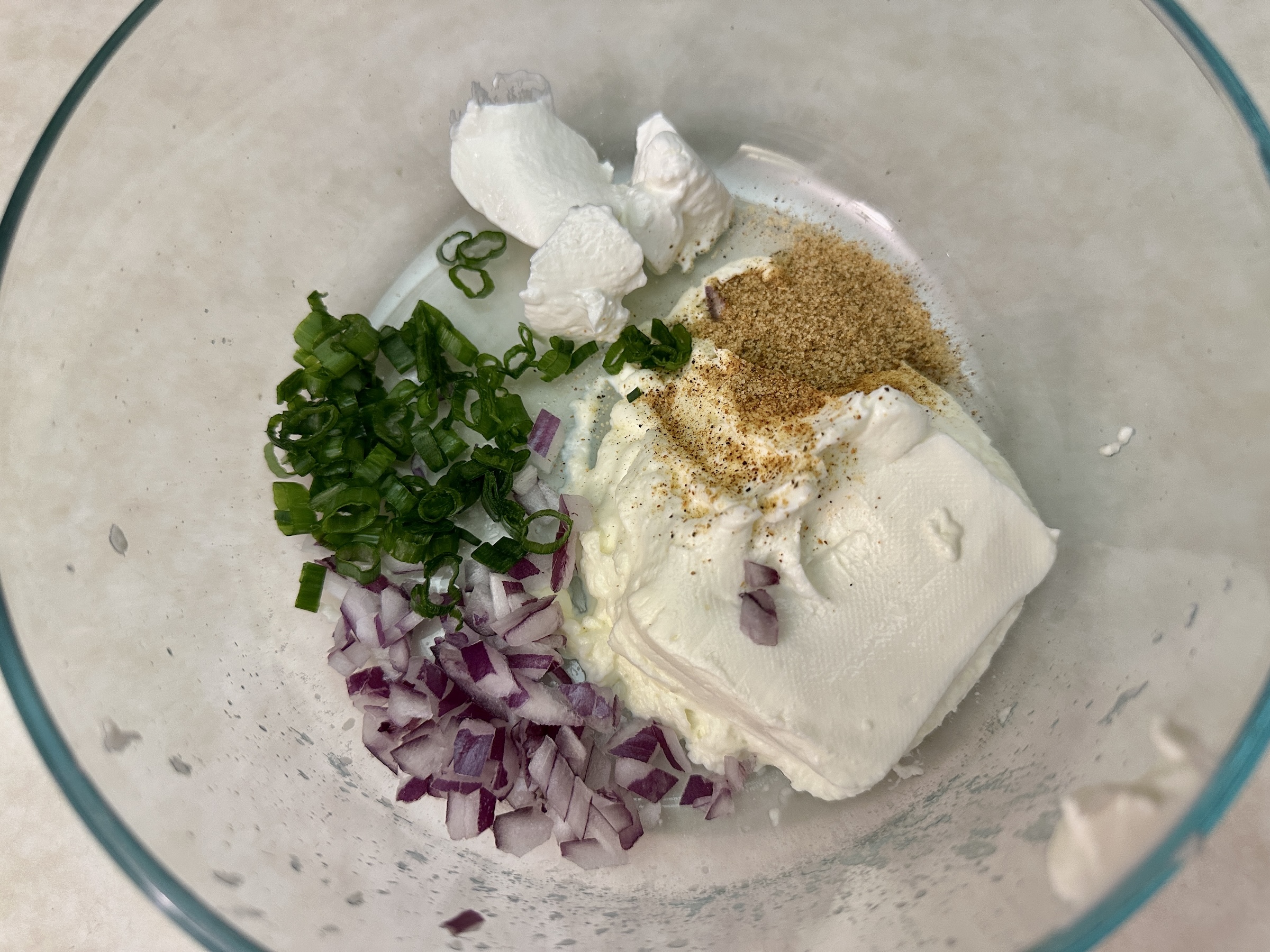 In a bowl, stir together softened cream cheese, sour cream, sliced green onions, red onion, and a sprinkle of Tony Chachere’s Lite Creole Seasoning for a flavorful base that’s impossible to resist.