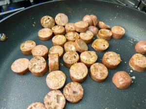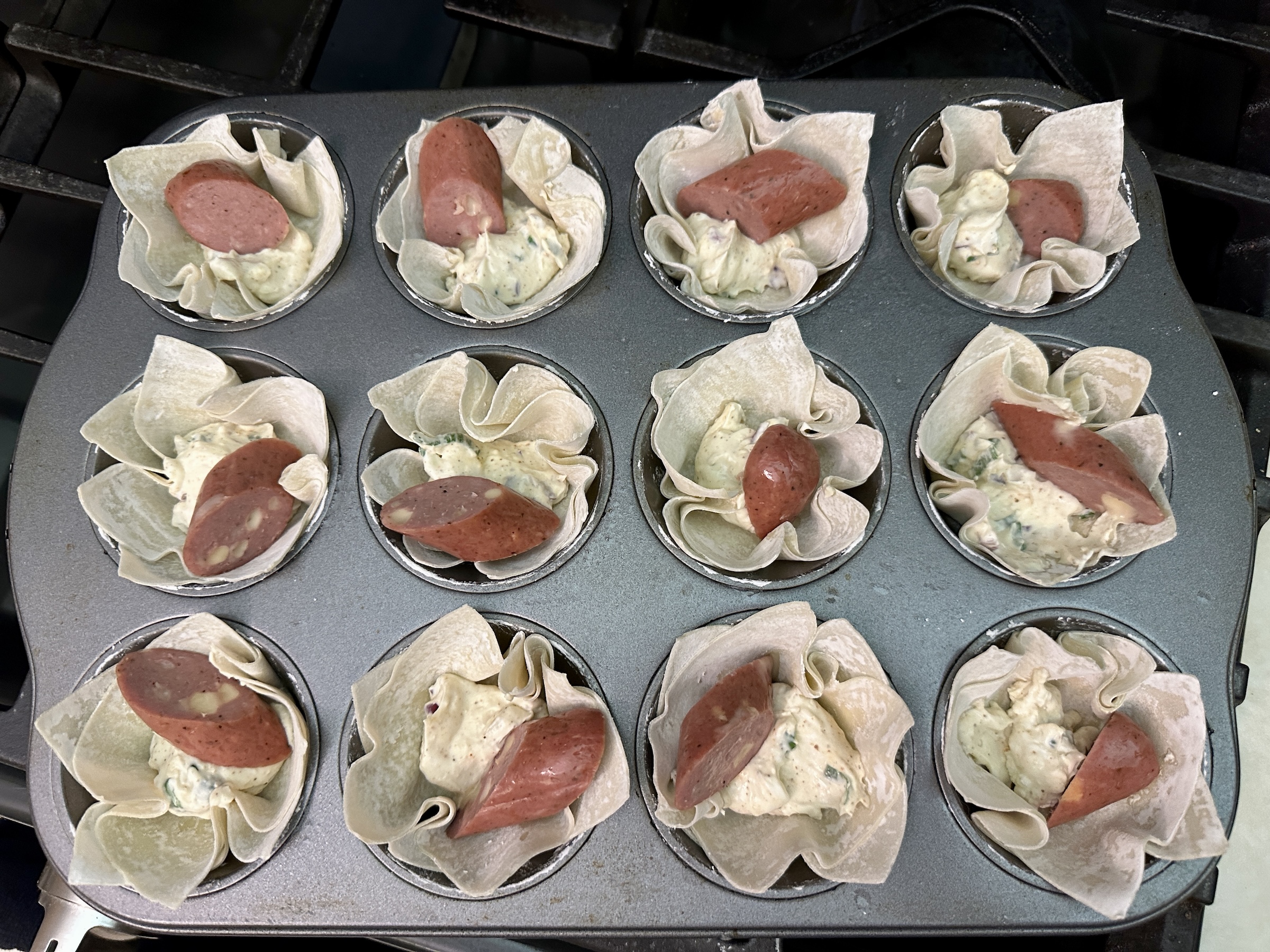 Press each wonton wrapper into the muffin tin to form little cups, fill them with the creamy mixture, and top each one with a slice of cooked Andouille sausage.
