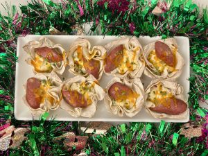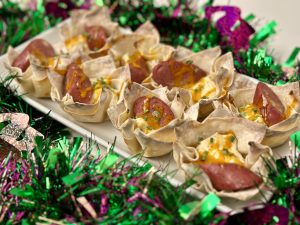 No Mardi Gras celebration would be complete without a bite-sized appetizer that’s bursting with flavor—and these Creole Cream Cheese Wonton Cups fit the bill perfectly! Crispy wonton wrappers cradle a creamy, tangy filling seasoned with Tony Chachere’s Lite Creole Seasoning, bright green onions, and just a hint of red onion for a subtle kick. Topped with a slice of savory Andouille sausage and finished with a zesty Creole-inspired sauce, these little cups are a party on a plate—perfect for nibbling while you sip, dance, or toss beads.