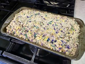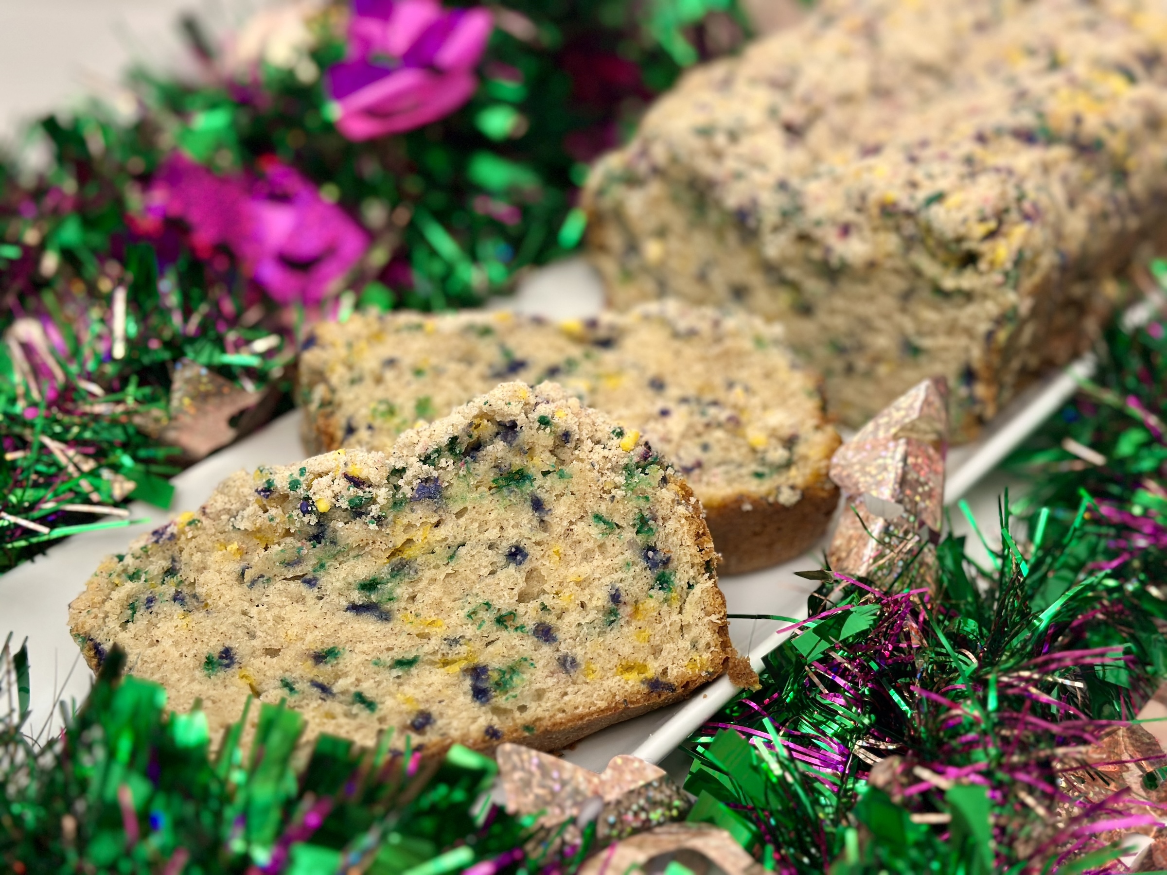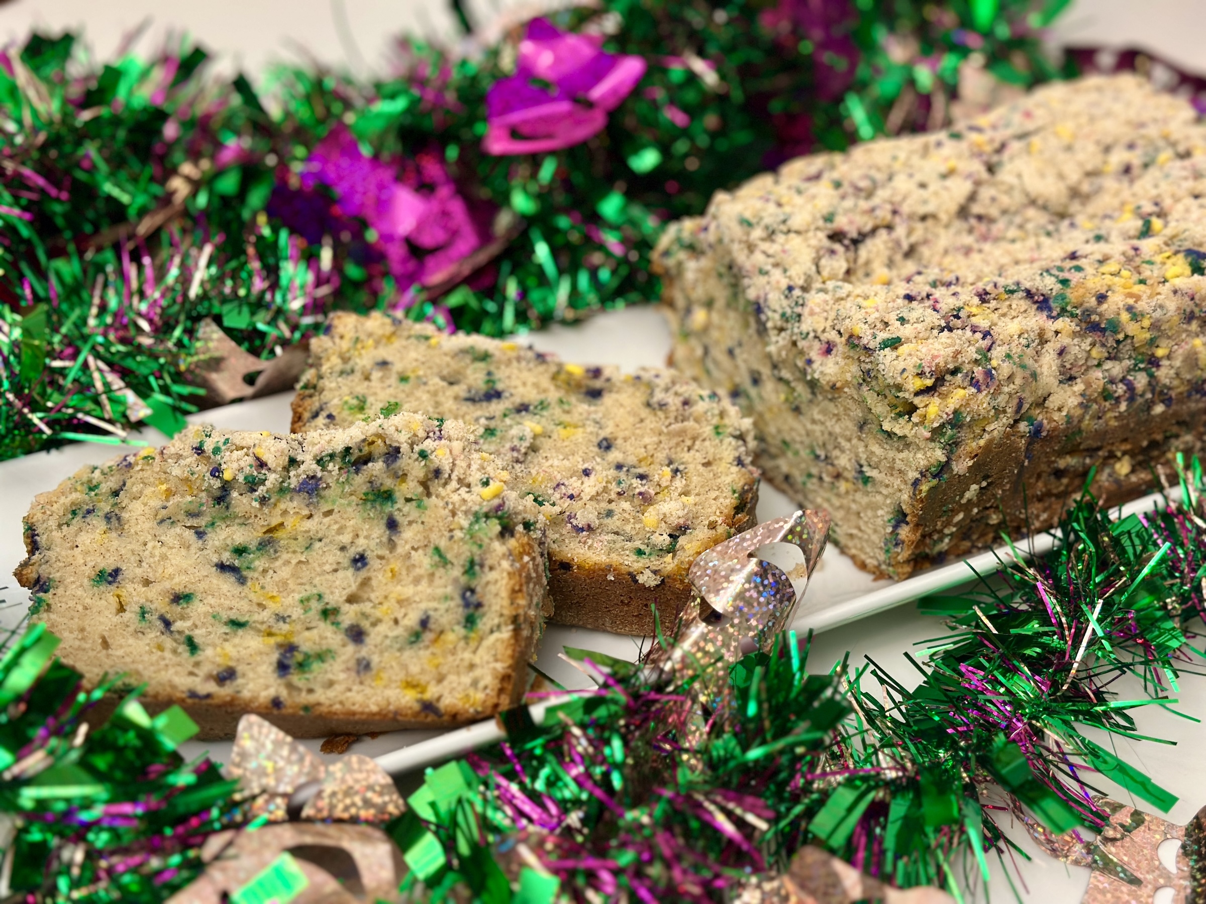 After the rich, creamy indulgence of the Pappadeaux Mardi Gras Pasta, it’s time to end your celebration on a sweet and colorful note. What better way to do that than with a Mardi Gras Streusel Bread? This festive loaf is bursting with green, purple, and gold jimmies, swirling through a tender, buttery batter and topped with a crumbly, colorful streusel. It’s playful, comforting, and just the right touch of sweetness to close out your Mardi Gras feast. While everyone is still savoring the flavors of shrimp, sausage, and creamy Parmesan, the aroma of this baked bread will fill your kitchen and get everyone excited for dessert. Whether sliced and shared at the table or enjoyed as an after-party snack, this streusel bread brings the perfect final flourish to your Mardi Gras spread.