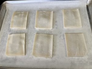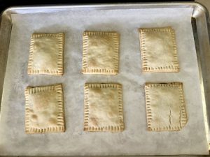 Unroll both pie crusts and cut each one into a rectangle, discarding the excess dough. Slice each rectangle into 6 equal pieces. Place 6 pieces on the prepared baking sheet, leaving space between each, and set the remaining 6 aside for the tops.