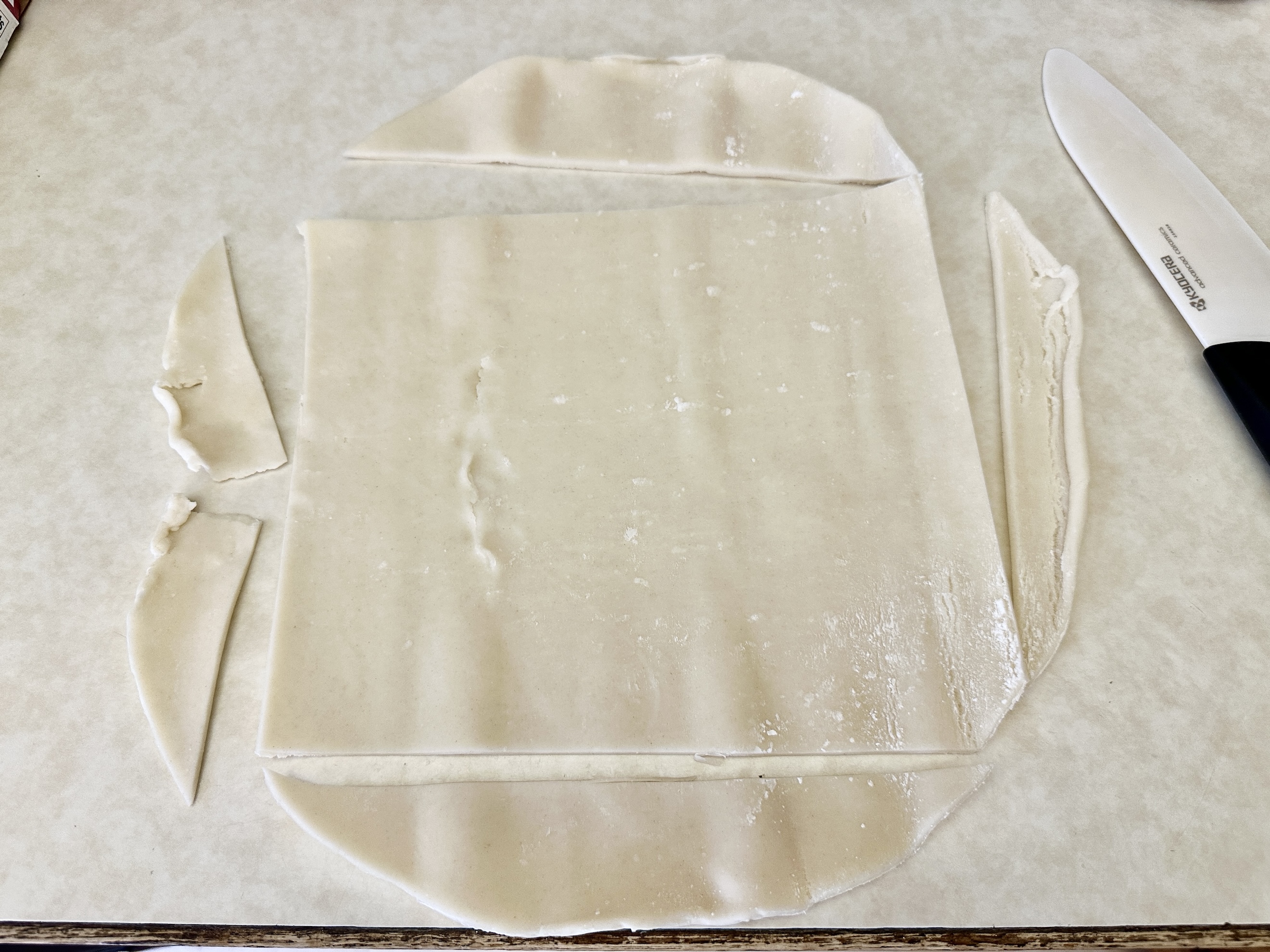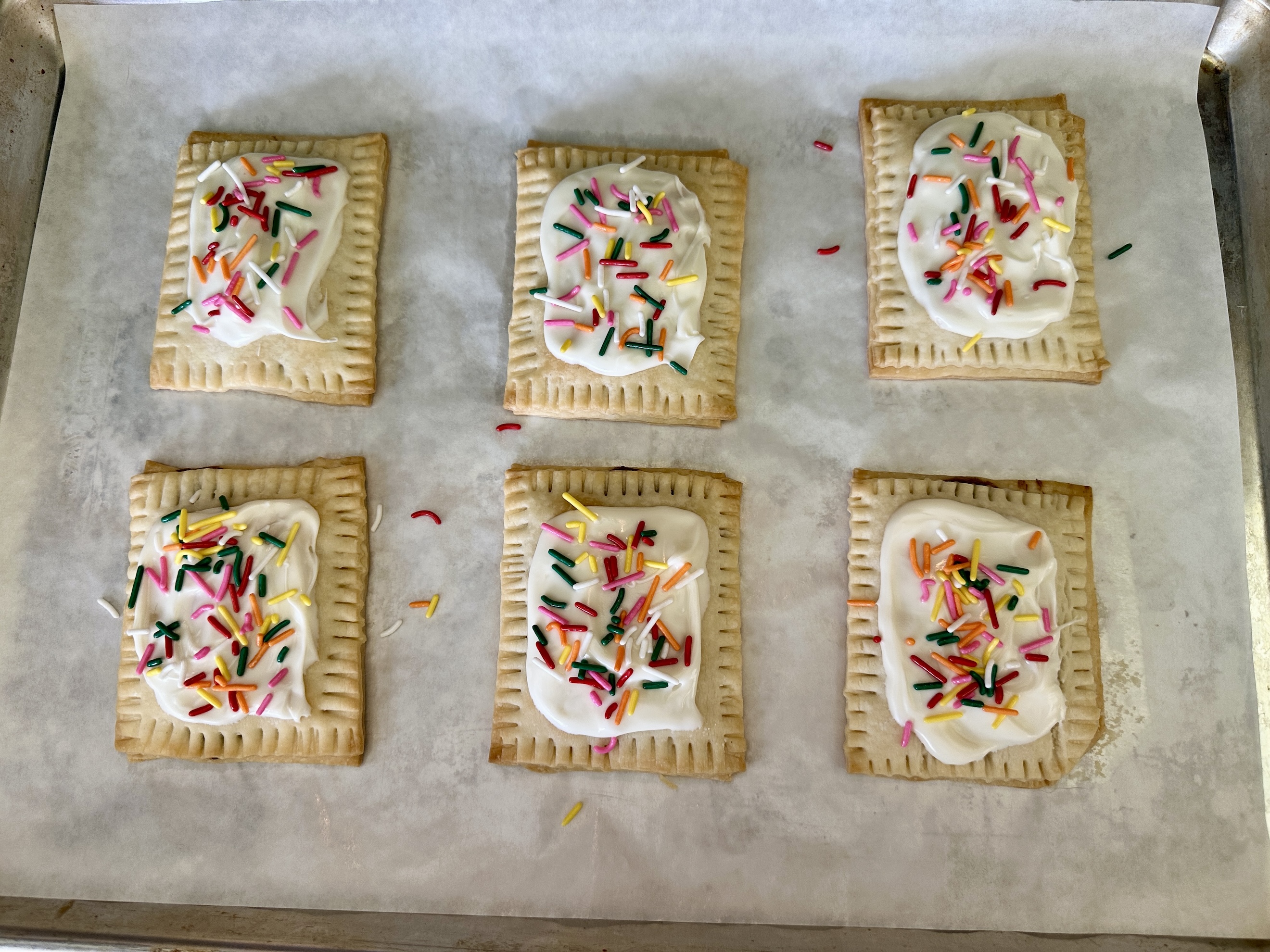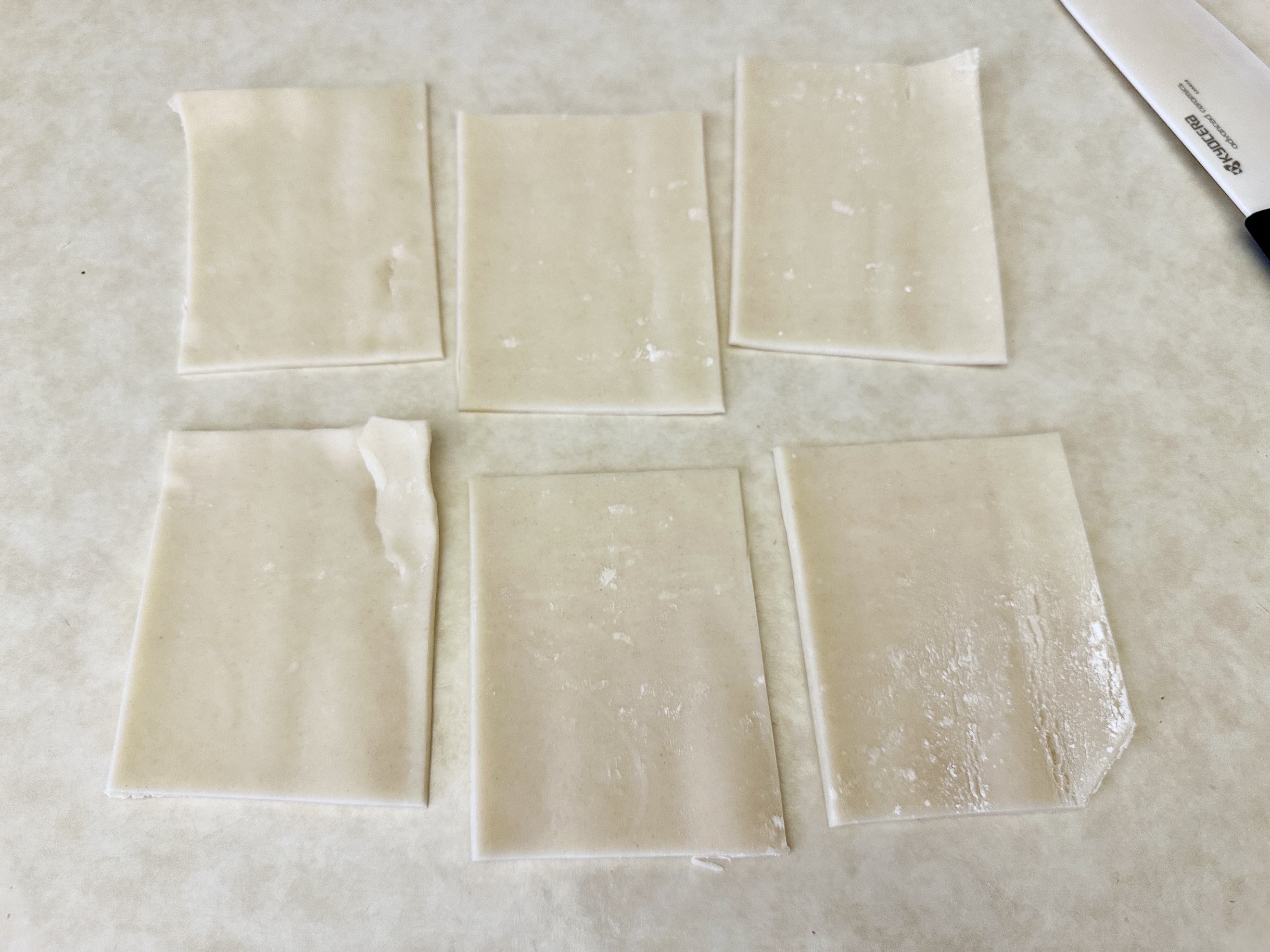 Unroll both pie crusts and cut each one into a rectangle, discarding the excess dough. Slice each rectangle into 6 equal pieces. Place 6 pieces on the prepared baking sheet, leaving space between each, and set the remaining 6 aside for the tops.