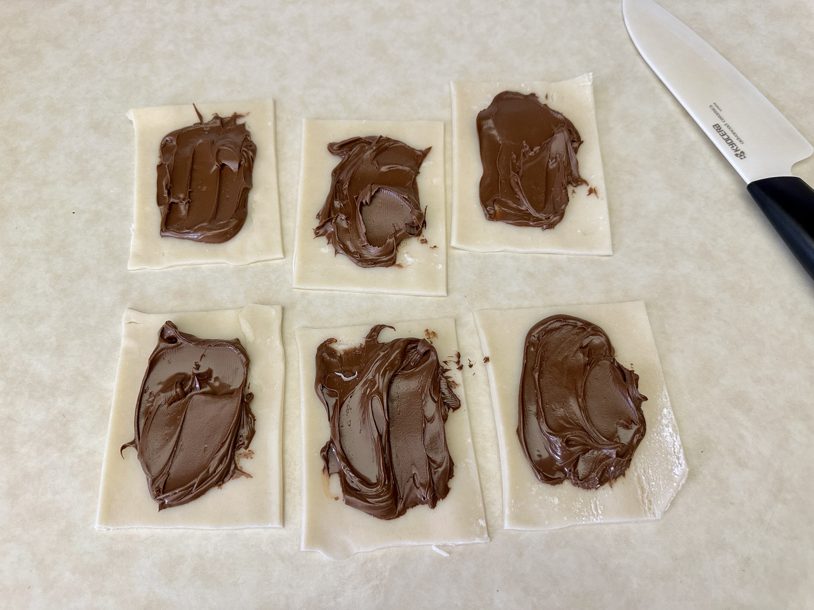 Spread a generous layer of Nutella onto the 6 pieces of dough on the baking sheet, leaving a small border around the edges. Don’t be shy here—a heaping scoop ensures plenty of Nutella in every bite.