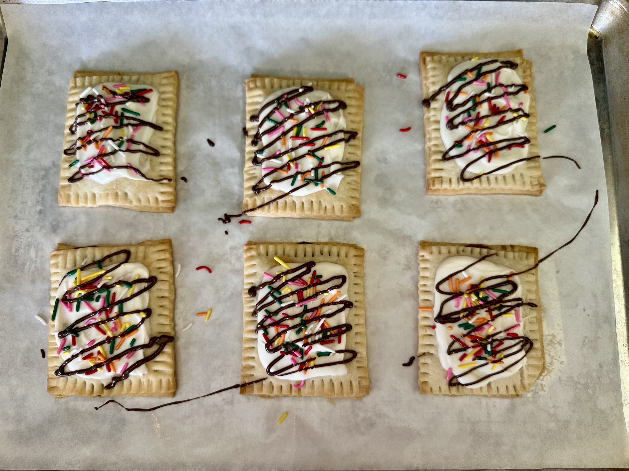 Melt the chocolate melts in a microwave-safe bowl using 30-second intervals, stirring until smooth. Transfer the melted chocolate to a Ziploc bag, snip a small corner, and drizzle over the pastries.