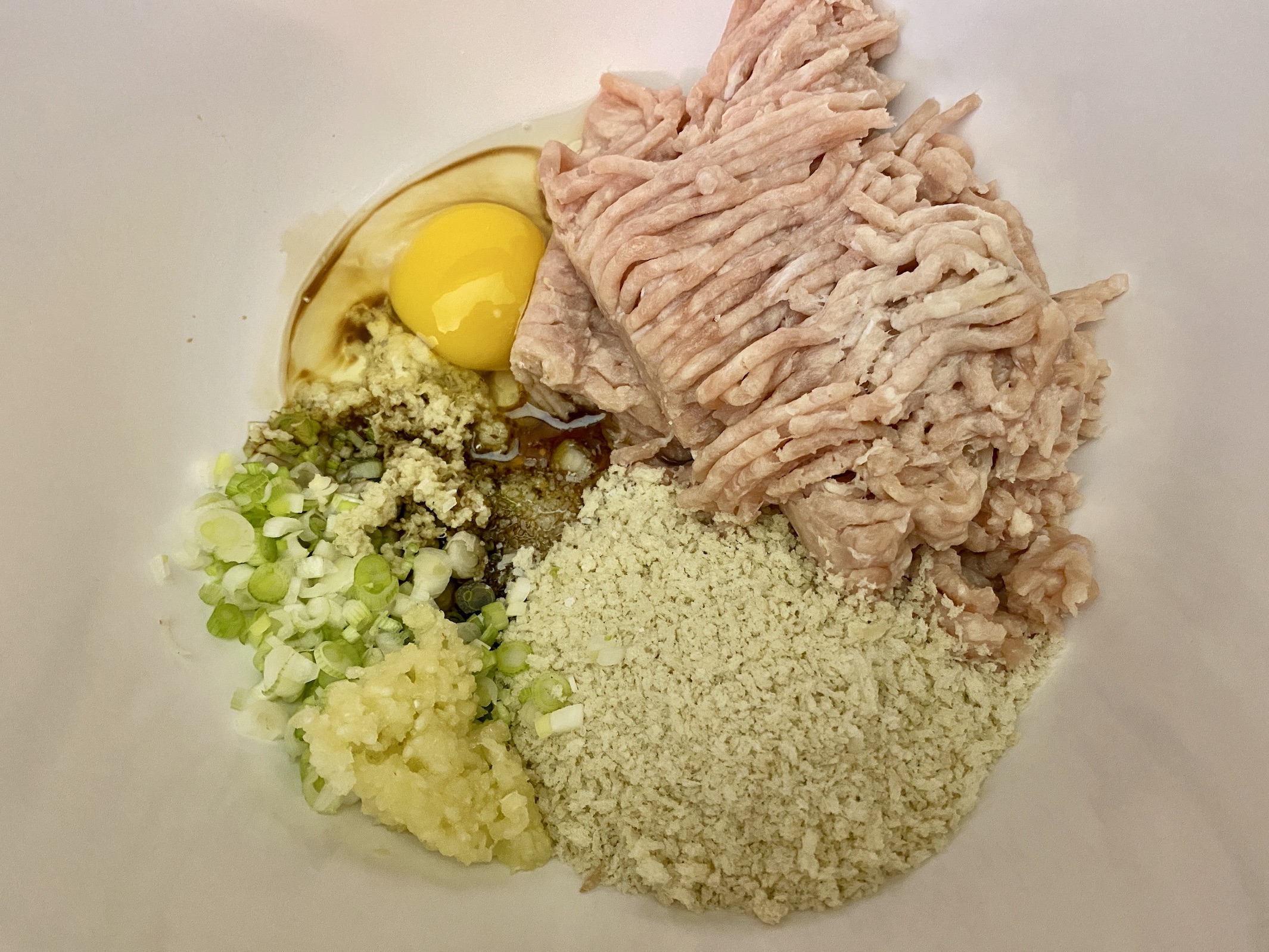 In a large mixing bowl, combine the ground chicken, breadcrumbs, green onions, garlic, ginger, egg, sesame oil, soy sauce, and salt. Mix until everything is evenly incorporated.