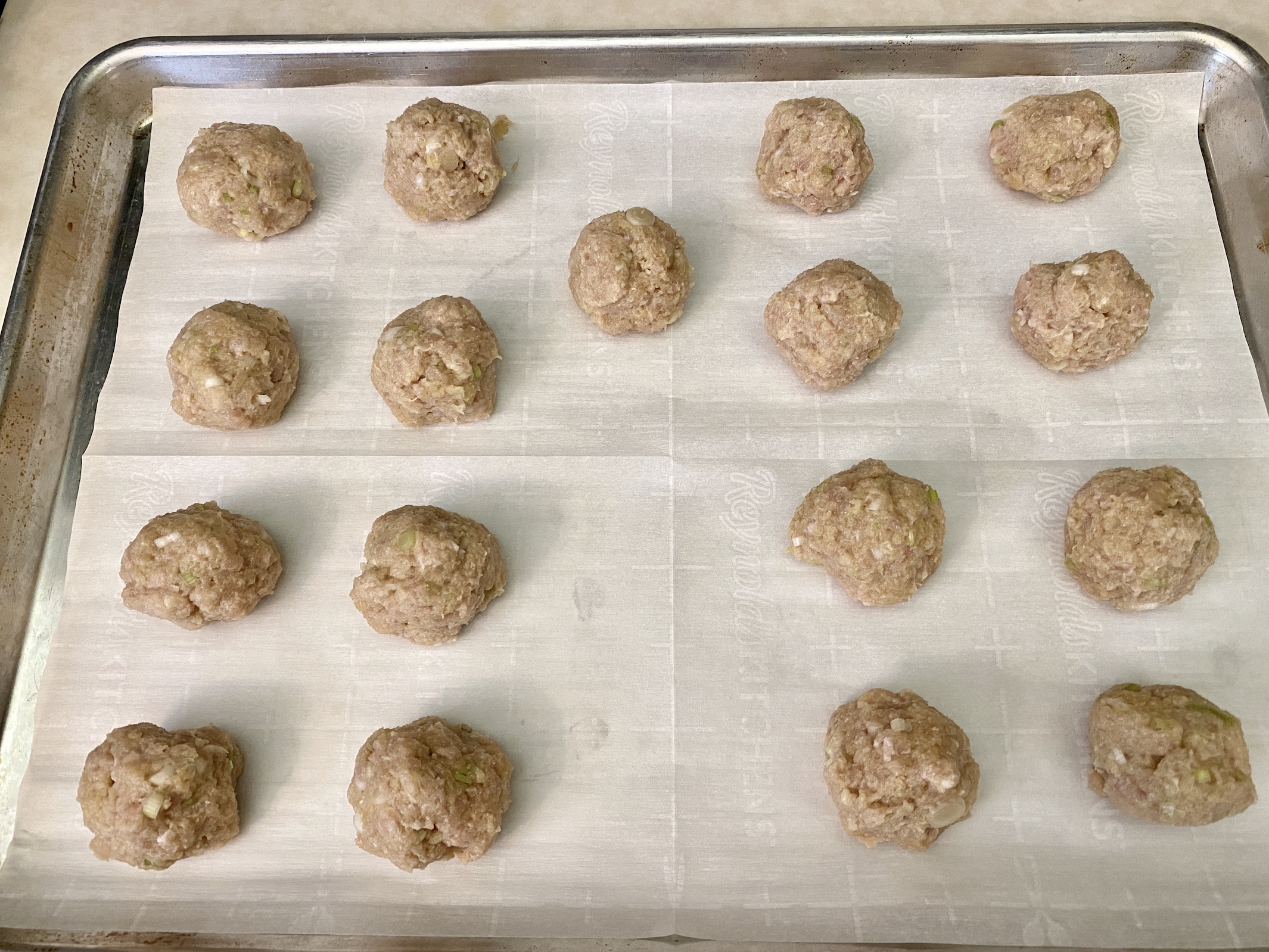 Form the mixture into 16 evenly sized meatballs and place them on the prepared baking sheet, leaving space between each one.