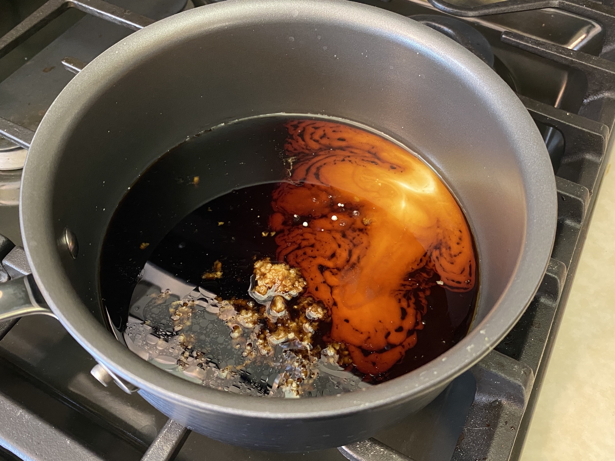 While the meatballs bake, prepare the glaze. Add the soy sauce, rice vinegar, garlic, honey, and sesame oil to a saucepan. In a small bowl, whisk together the cornstarch and water, then add it to the saucepan. Whisk until fully combined.