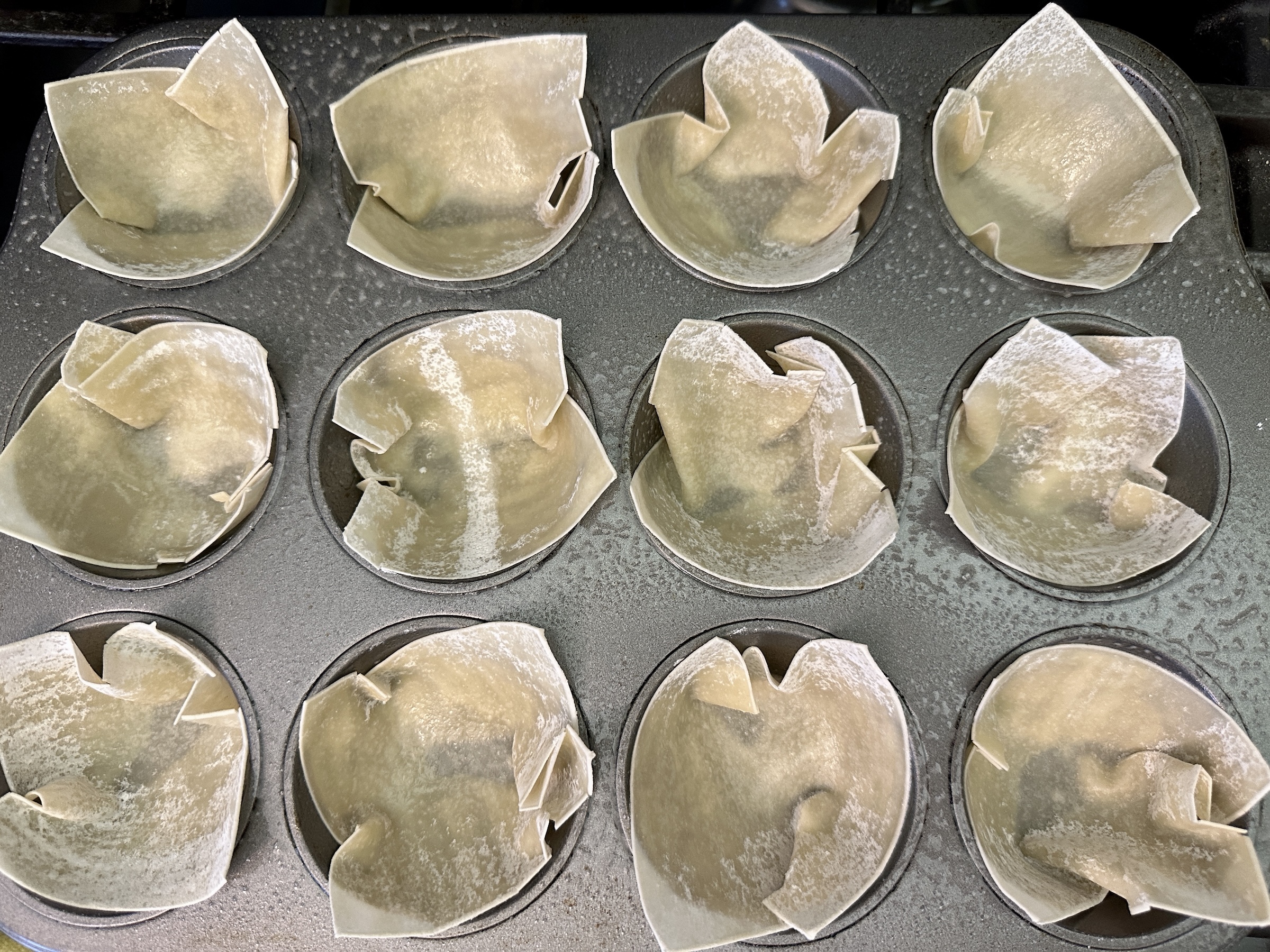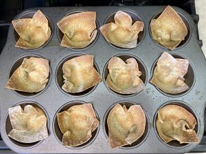 Place a wonton wrapper in each well and press down to create a mold. Spray with cooking spray. Bake for 10-12 minutes or until golden brown. Let cool then remove from the muffin tin.