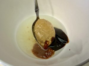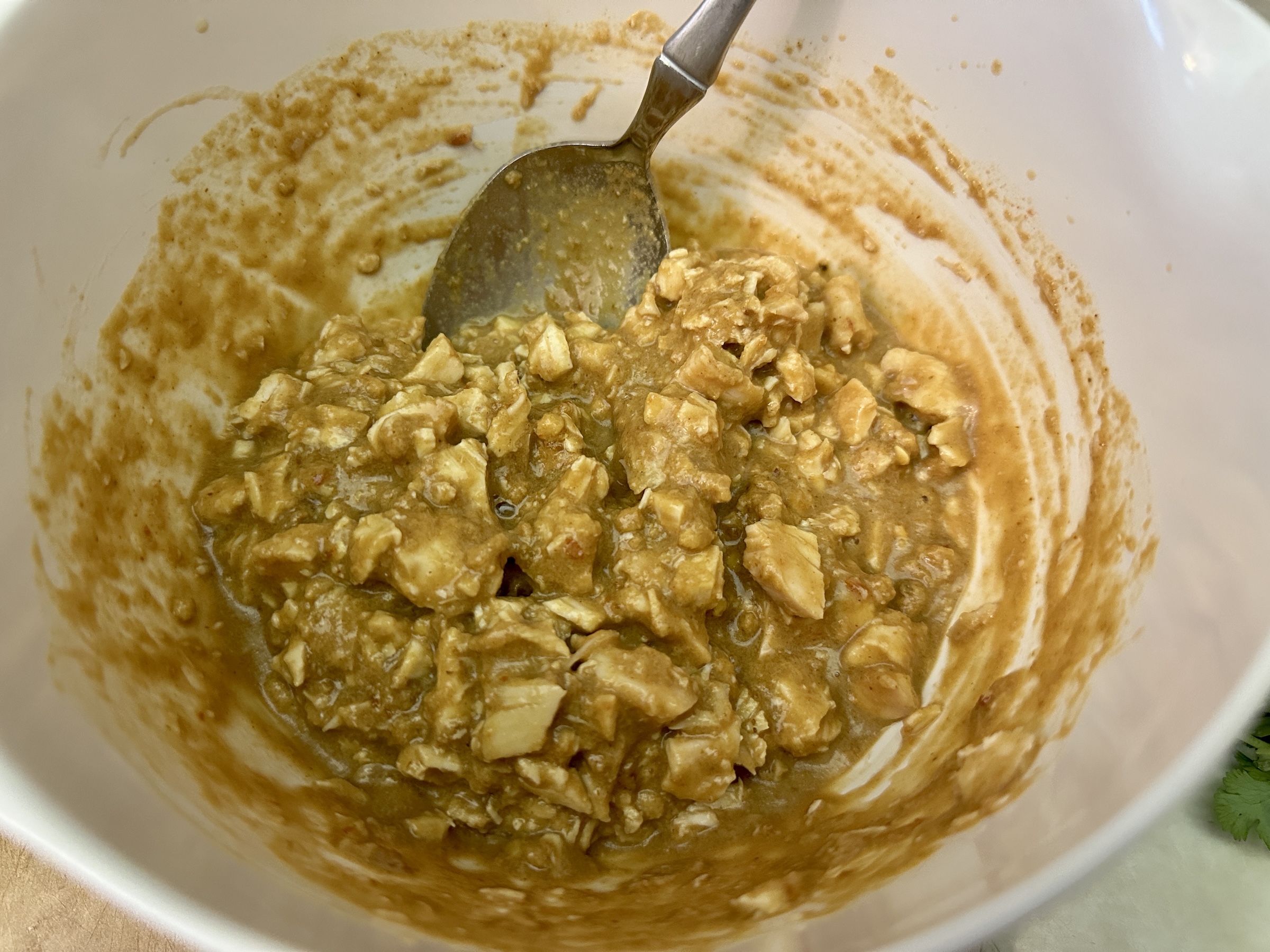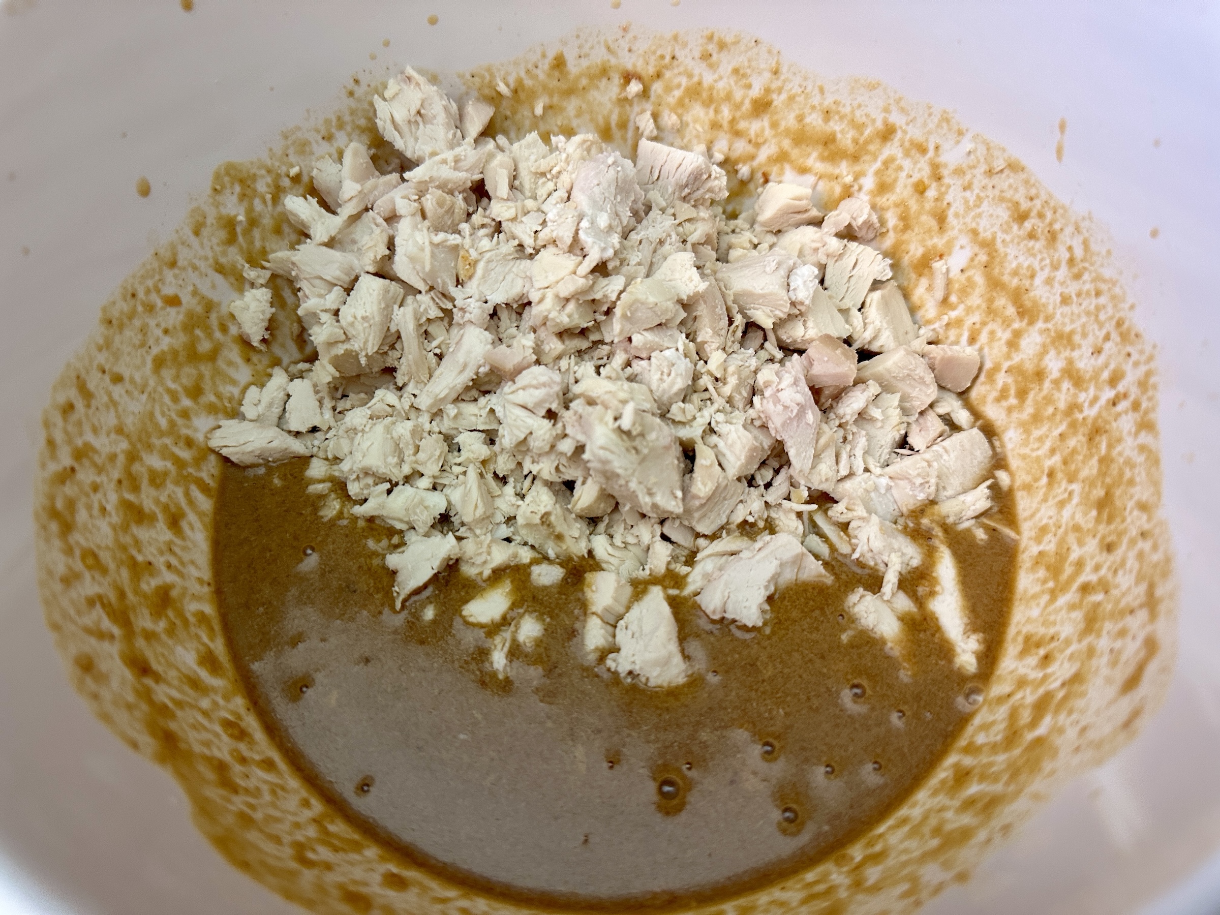 In a small bowl, whisk together the peanut butter, water, hoisin, chili paste, and 2 Tbsp lime juice. Remove about 1/3 cup and set aside. Add the chicken and toss to coat.