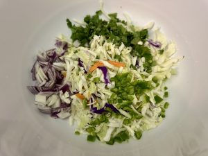 In a separate bowl, combine the pepper, coleslaw, red onion, cilantro, pinch of salt, and remaining 2 Tbsp lime juice. Toss to combine.