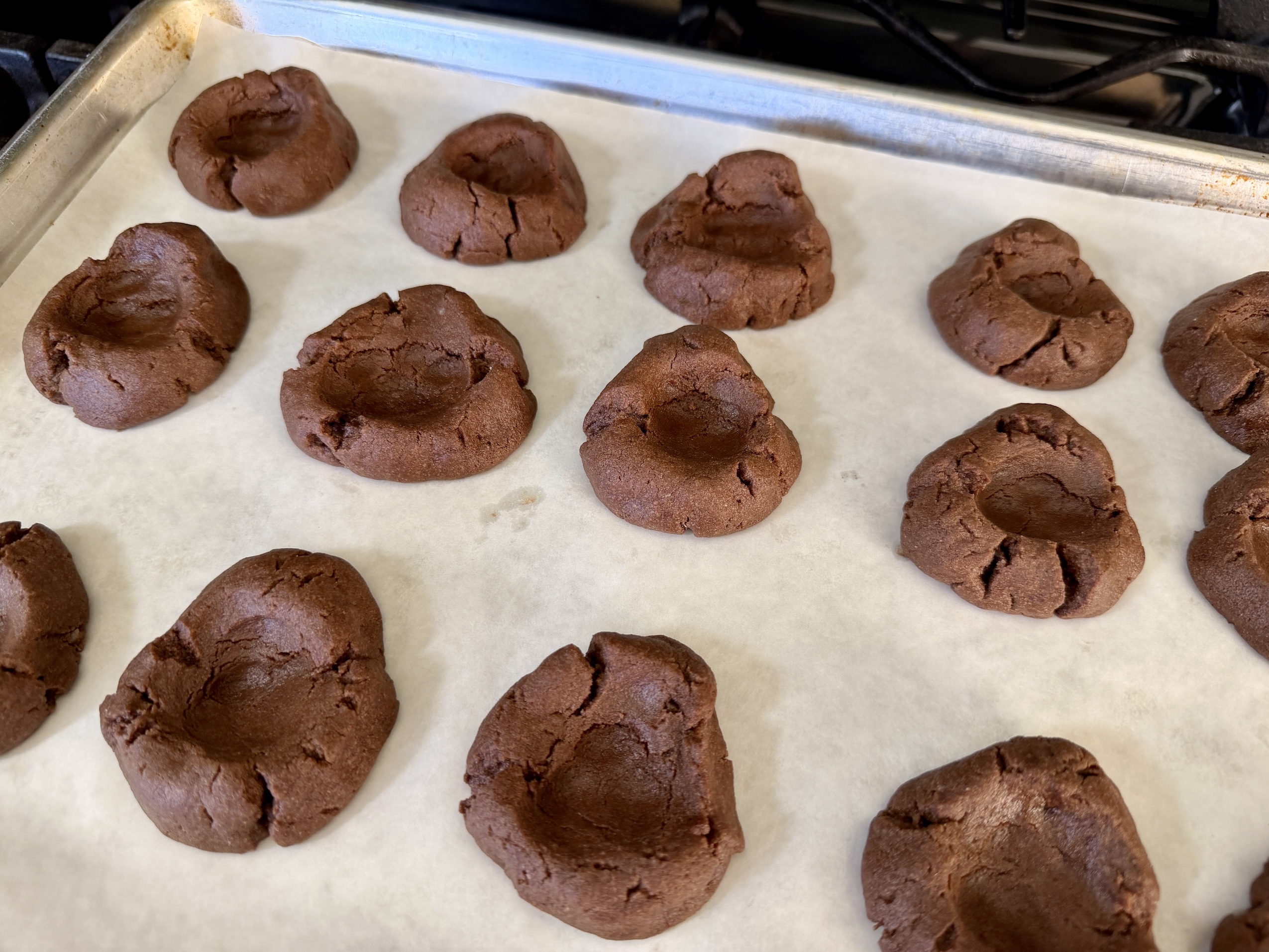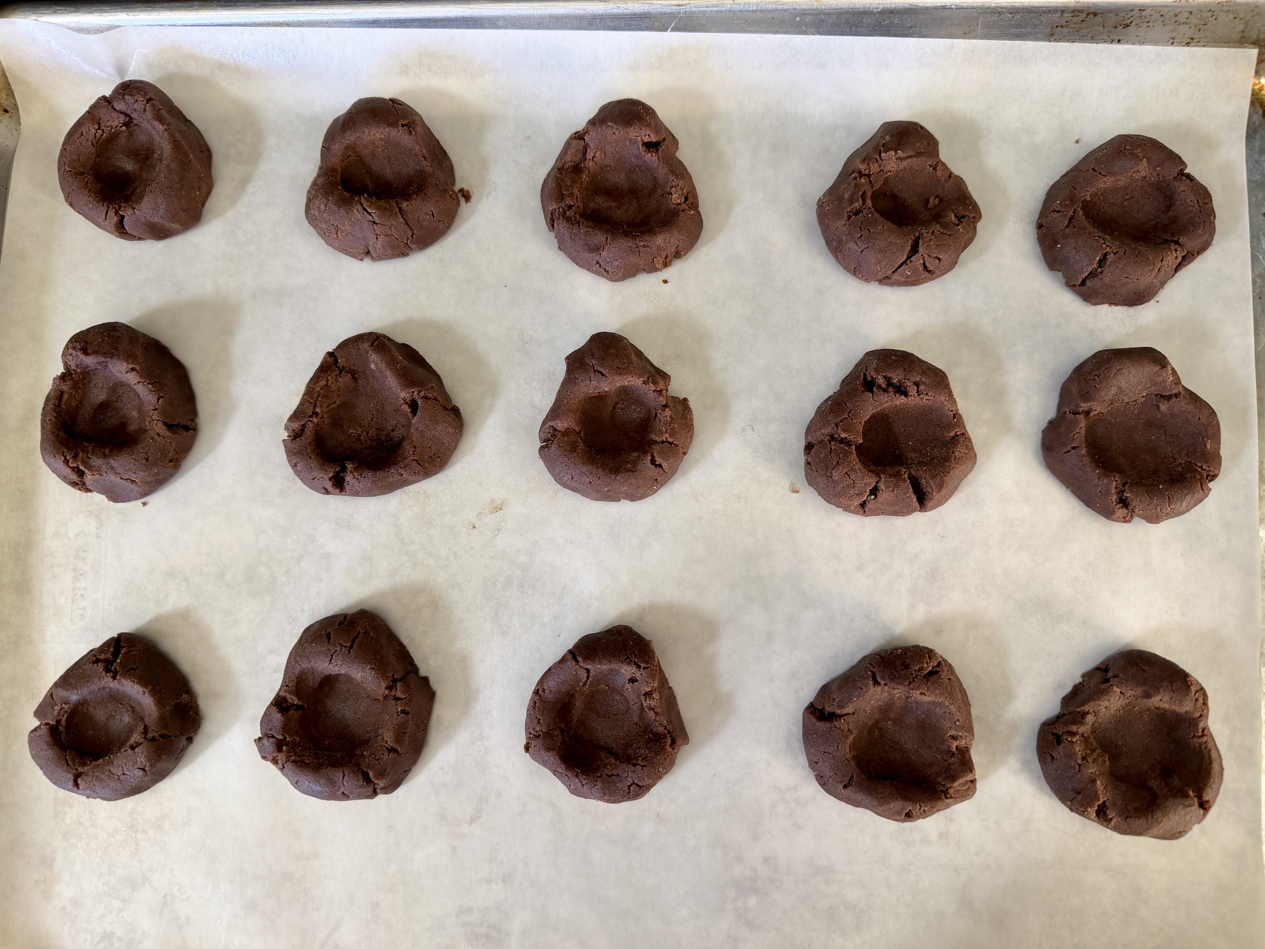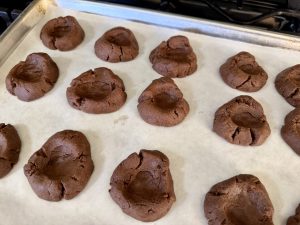 Roll the dough into balls and place them on your prepared baking sheet—you should end up with about 20 cookies. Using your thumb, gently press an indent into the center of each one. Bake for 7–8 minutes, then remove from the oven and carefully press the centers again while they’re still warm to maintain that perfect little pocket for the glaze. Let the cookies cool slightly before transferring them to a wire rack to cool completely.