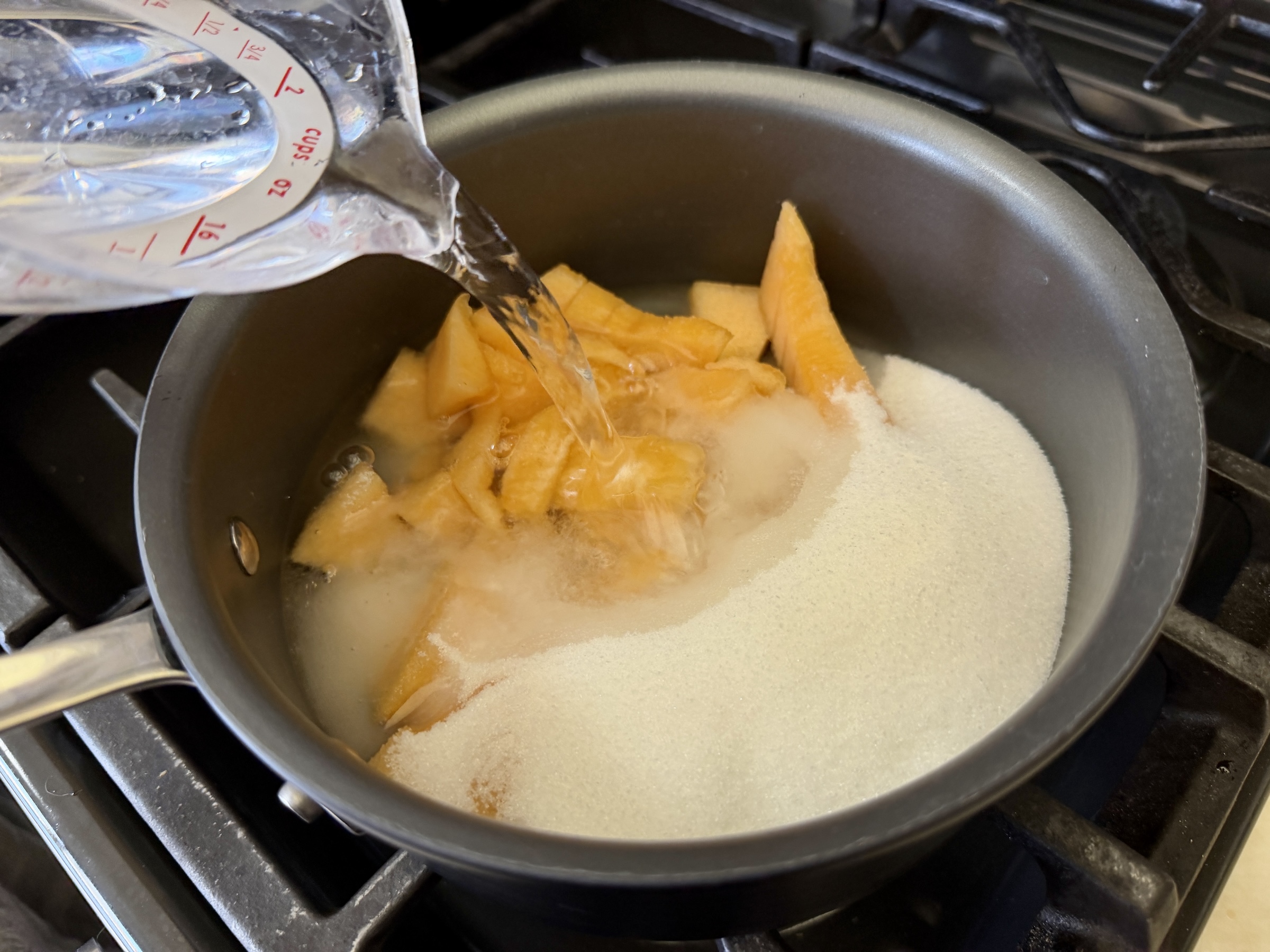Start by making your fruit-infused simple syrups—this is where all that fresh, summery flavor comes from. In a small saucepan, combine sugar, water, and chunks of ripe cantaloupe. Bring the mixture to a boil, then lower the heat and let it gently simmer for about 10 minutes. Once it’s fragrant and slightly thickened, strain out the solids and set the syrup aside to cool completely. You’ll end up with about a cup, which can be stored in the fridge and used for more drinks later.