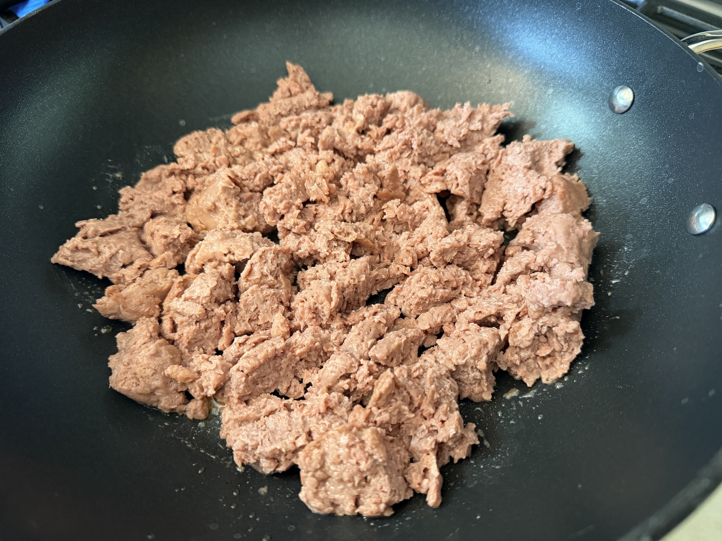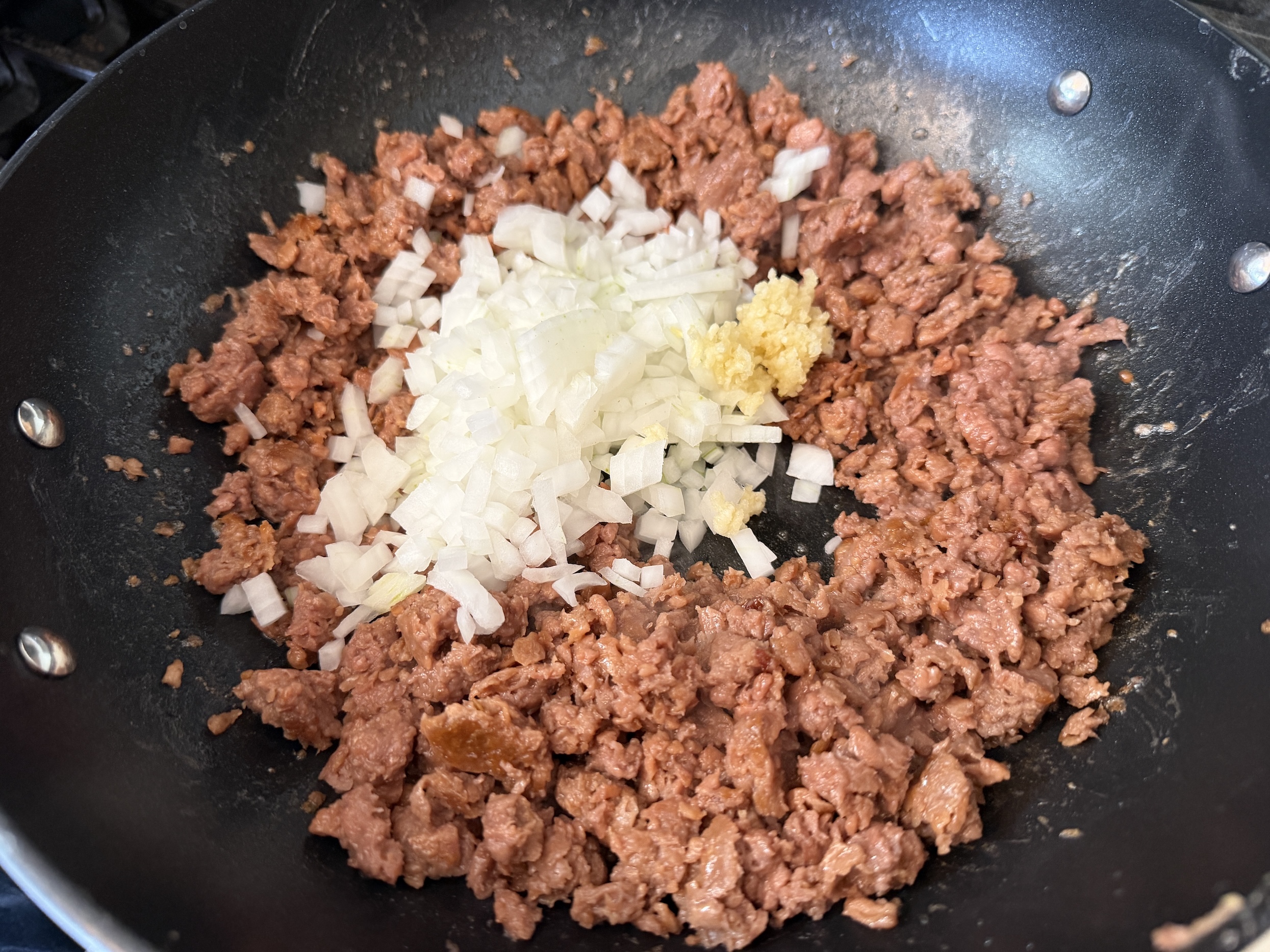Start by heating a drizzle of oil in a large skillet over medium heat. Add your plant-based meat, such as Impossible or Beyond, and cook it until browned and fully heated through, breaking it up into crumbles as it cooks for that classic hearty texture.
