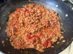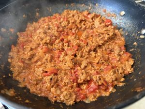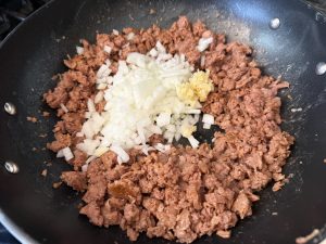 Once the meat is cooked, stir in the garlic and onion. Let everything cook together for another minute or two until fragrant and softened—this step builds a rich, savory base for your sauce.