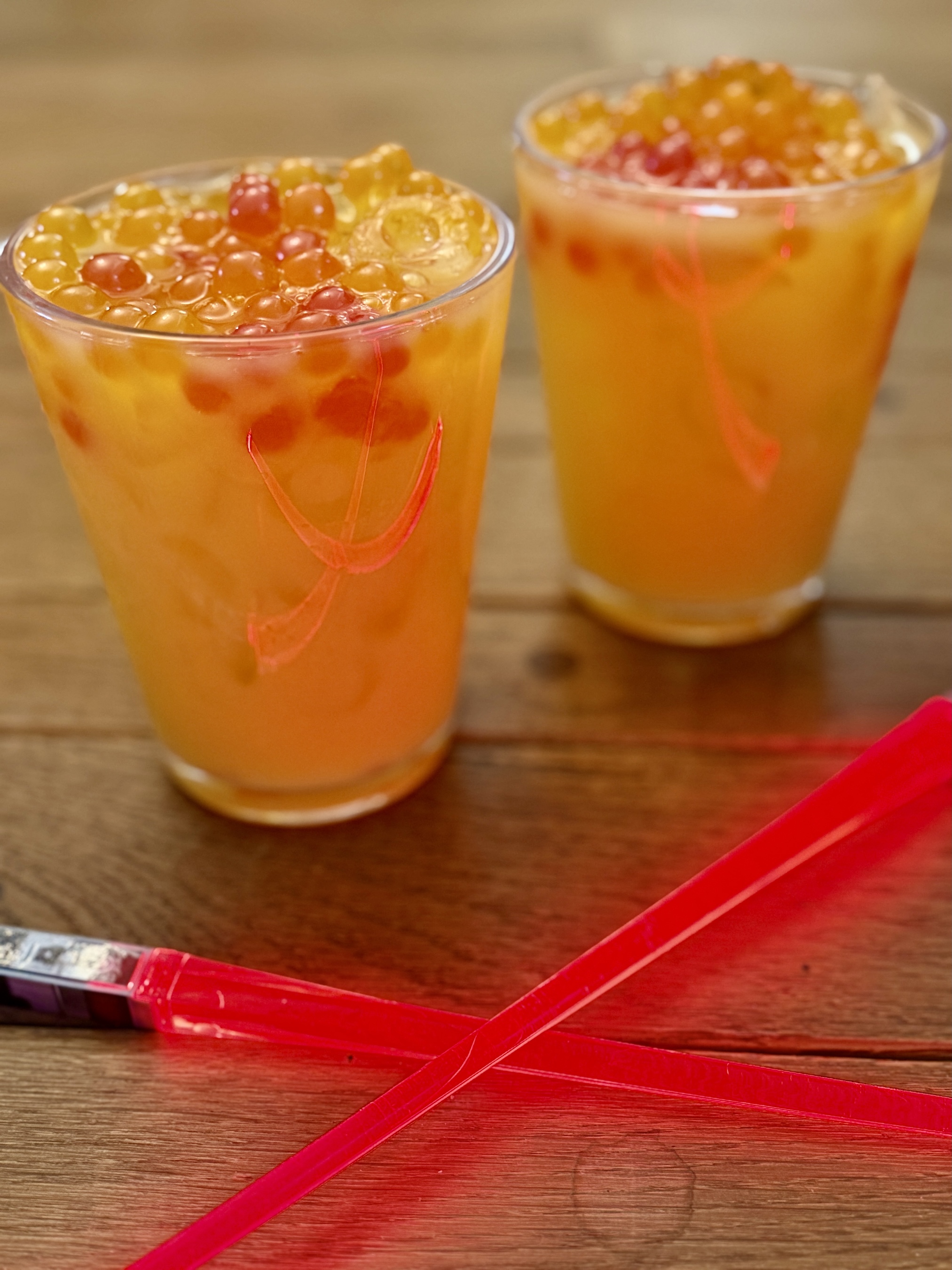 Paired with orange and pineapple juice, the syrups create a smooth, fruity base that’s both kid-friendly and party-ready. And for that final fun touch, a scoop of boba popping pearls adds a burst of flavor and texture—giving your Jabba Juice an outer-space vibe in every sip.