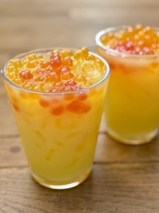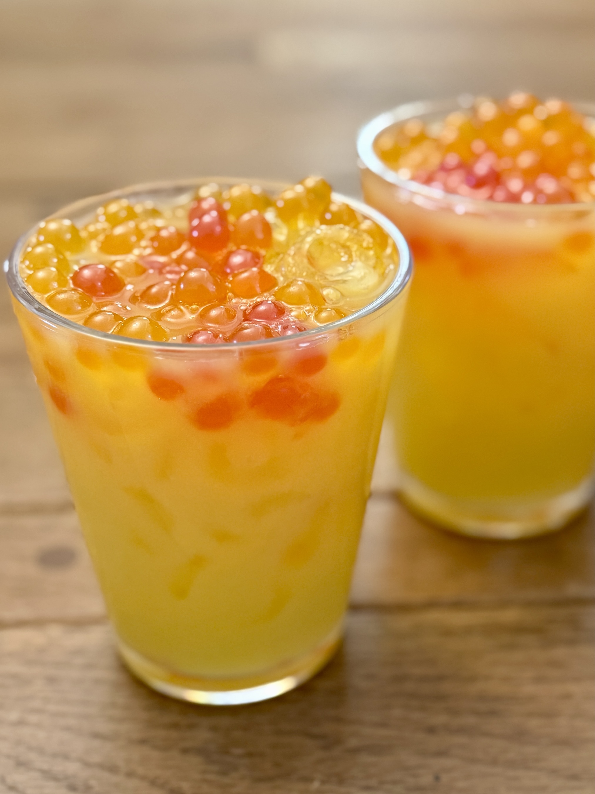 When you’re ready to assemble your drink, fill a glass with ice and pour in the orange juice, pineapple juice, and both simple syrups. Give everything a good stir to blend the flavors together. Finish it off with a generous scoop of boba popping pearls for a fun, juicy burst in every sip. Serve immediately and enjoy—this recipe makes one drink.