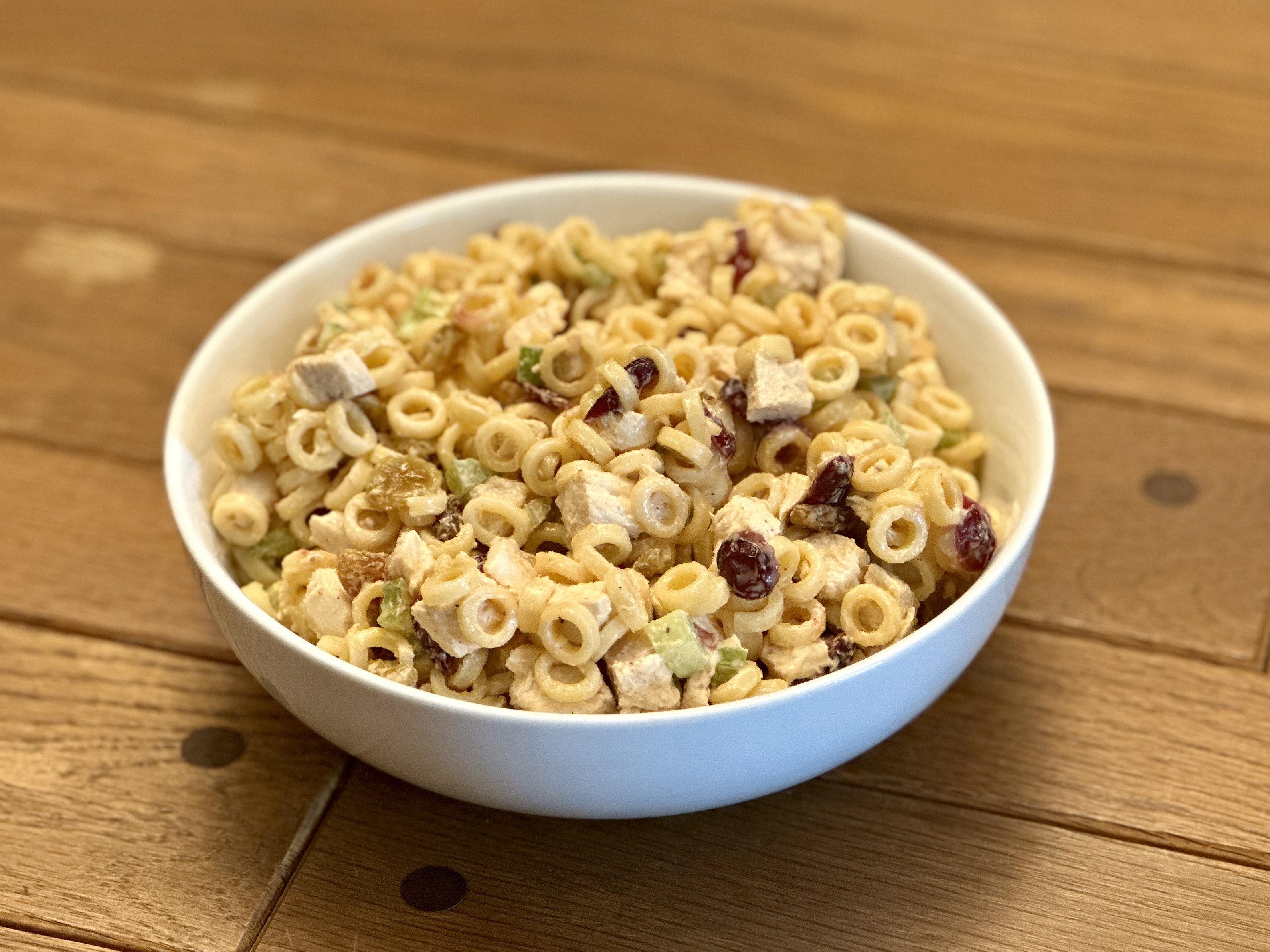 3. Add the noodles, chicken, celery, and cranberries (optional) to a large mixing bowl. Stir to combine. Set aside.