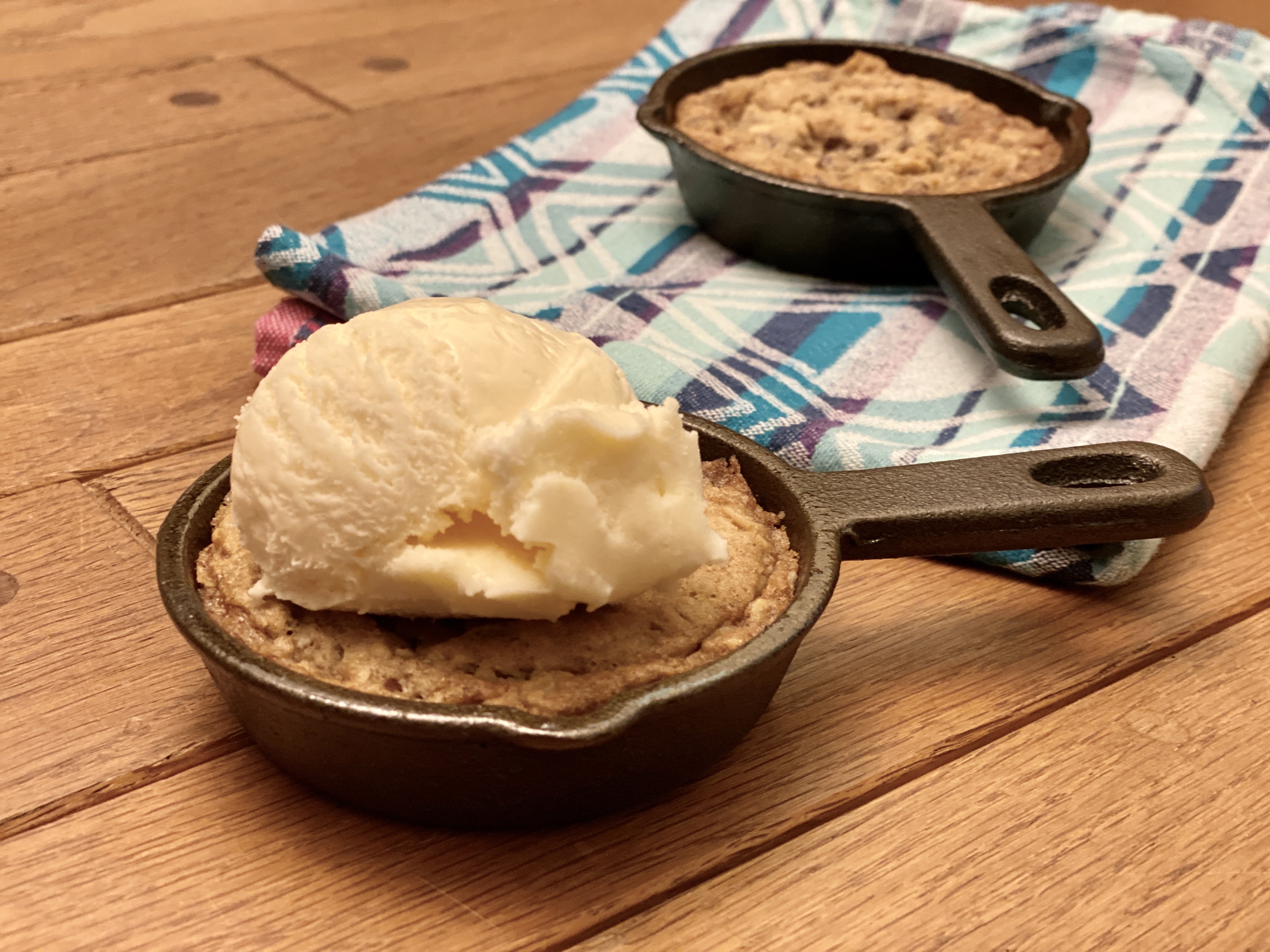 Use a cookie scoop to scoop the dough into the mini cast iron skillets (about 2-2 ½ Tbsp of dough per skillet).
