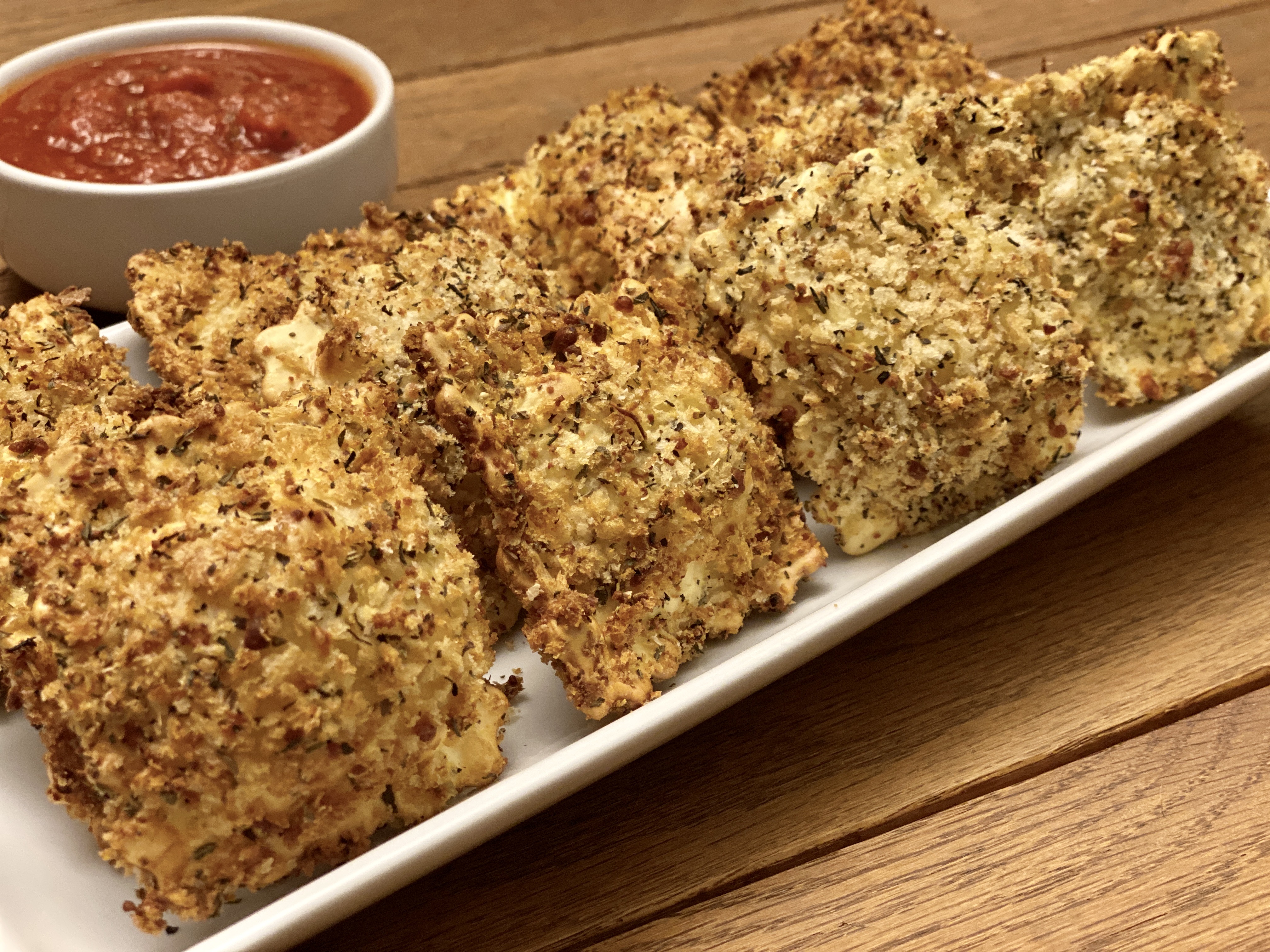Dip one ravioli in the egg mixture and use your fingers or a fork to let the excess drip off. Then add to the breadcrumb mixture coat completely. Shake off any excess breadcrumbs and place on the empty plate. Repeat until all ravioli has been coated.