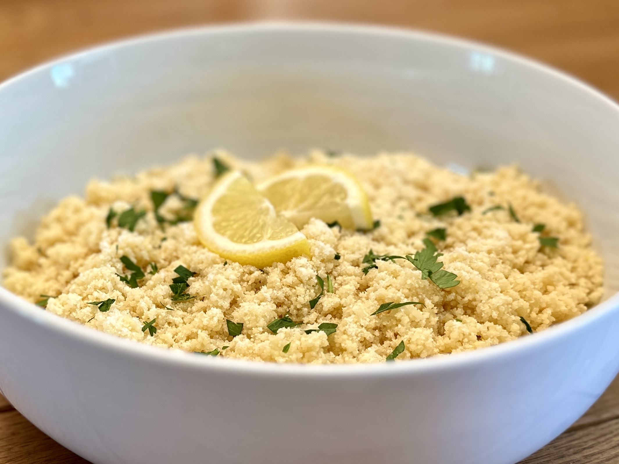 3. Add to the couscous to a large mixing bowl and fluff with a fork. Add the garlic, lemon zest, lemon juice, and parmesan cheese, and stir to combine.