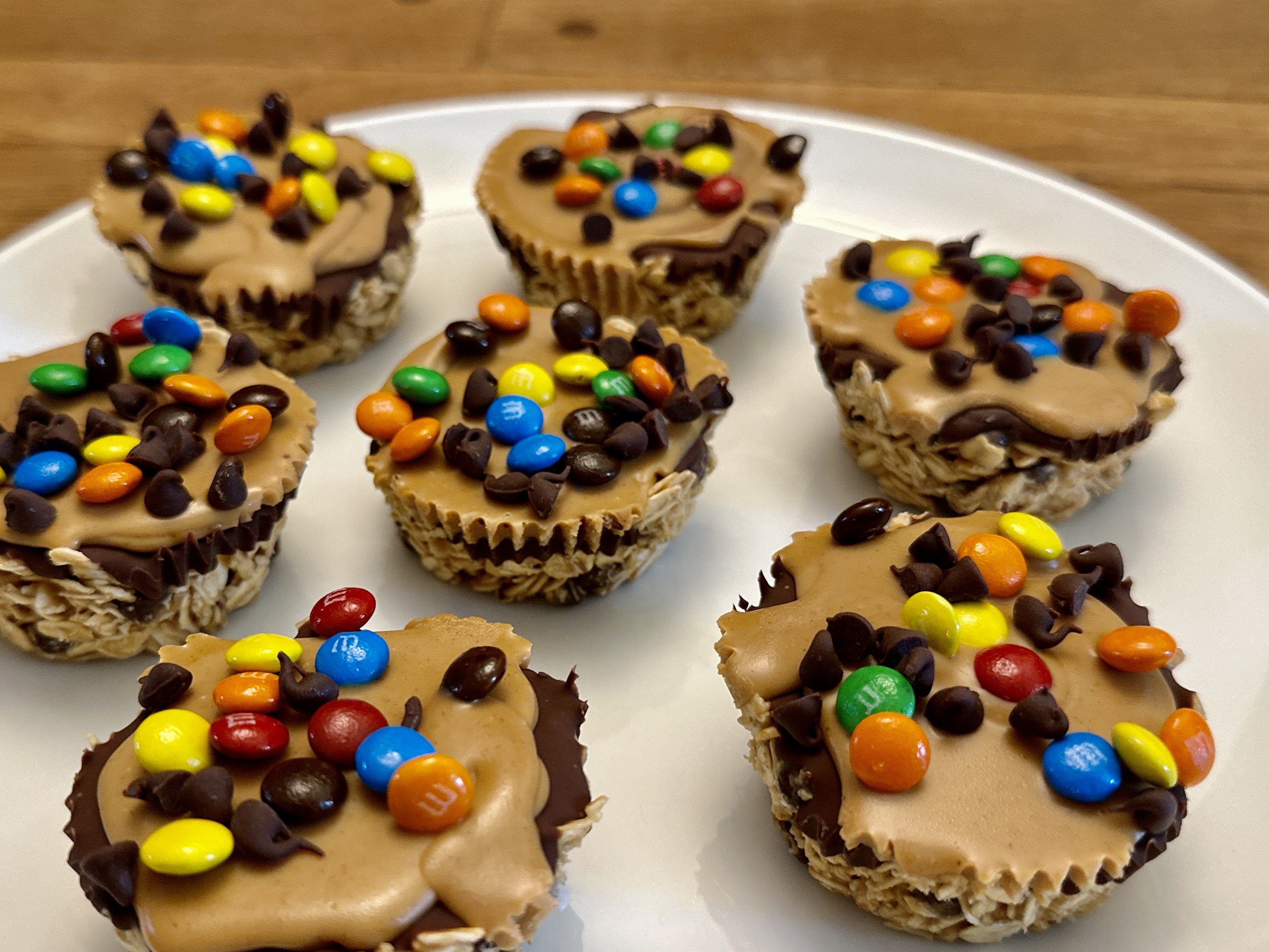 Add the oats, honey, 1/3 cup peanut butter, and mini chocolate chips to a mixing bowl and mix until well combined. Evenly divide between the 12 muffin cups and press down into an even layer.