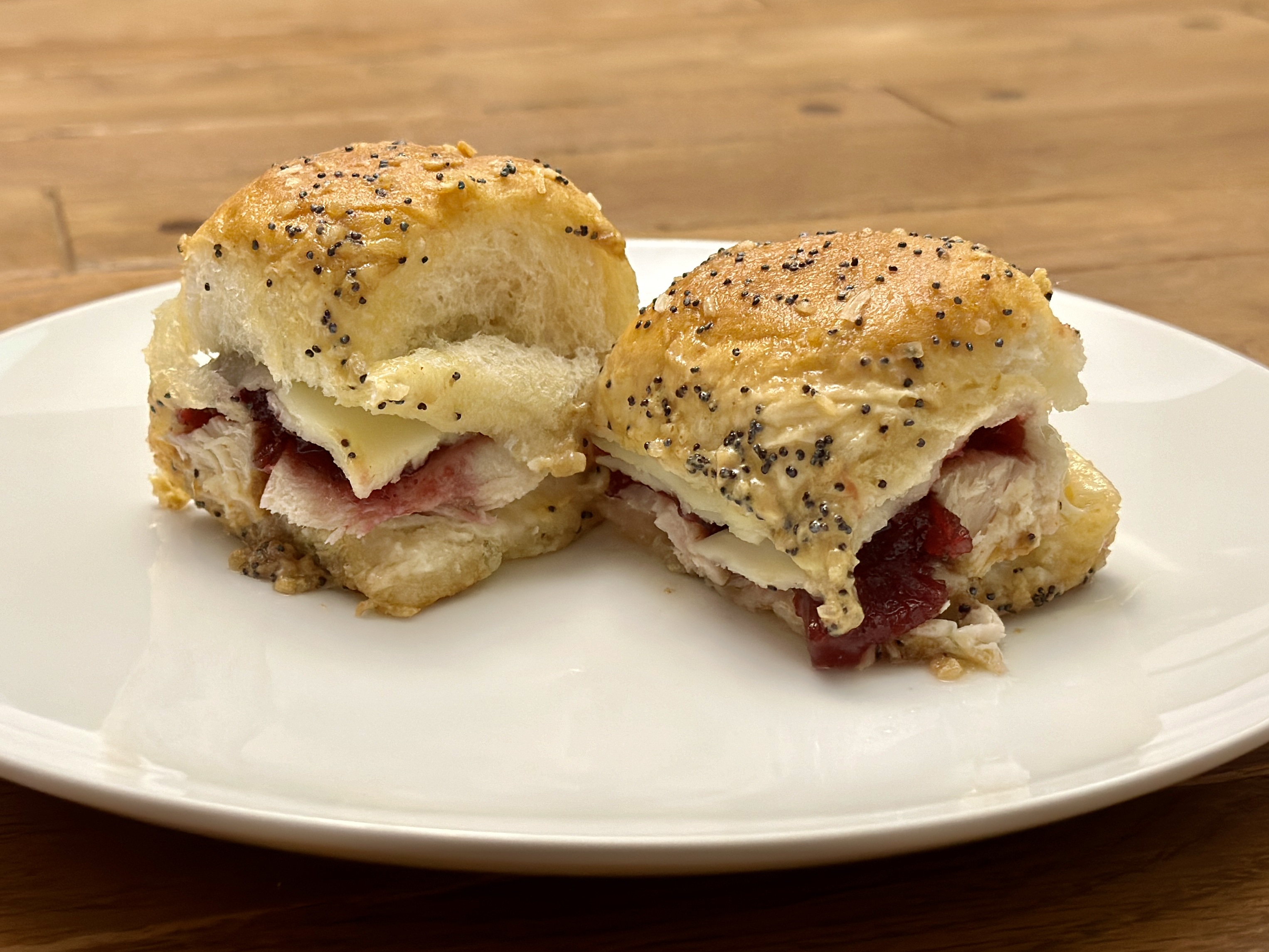 Layer the turkey across the rolls. Add the cranberry sauce and spread over the top of the turkey.