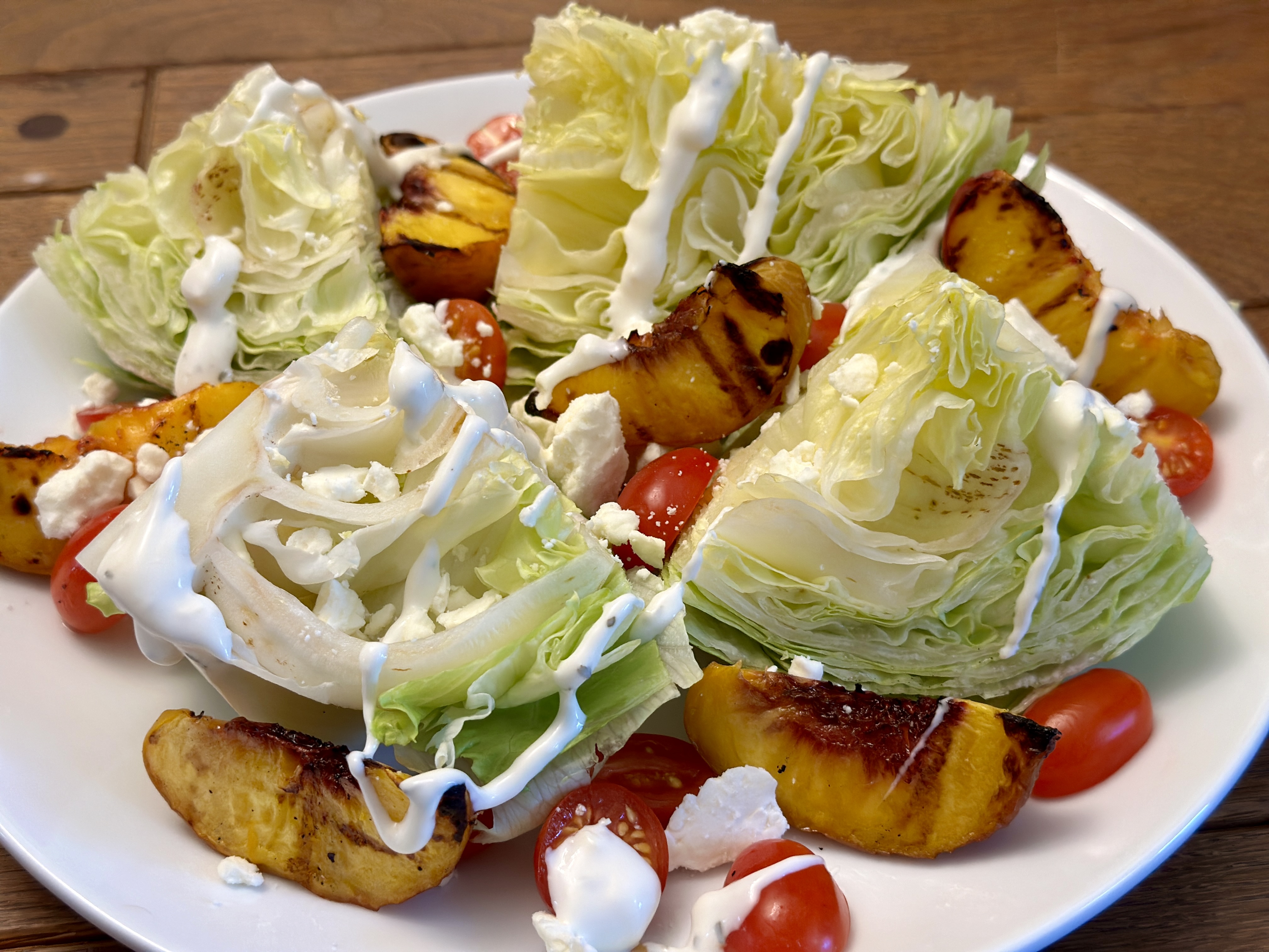 Arrange the lettuce wedges on plates. Top with the grilled peaches, sliced tomatoes, and crumbled feta. Drizzle ranch or blue cheese dressing over the top. Serve and enjoy!