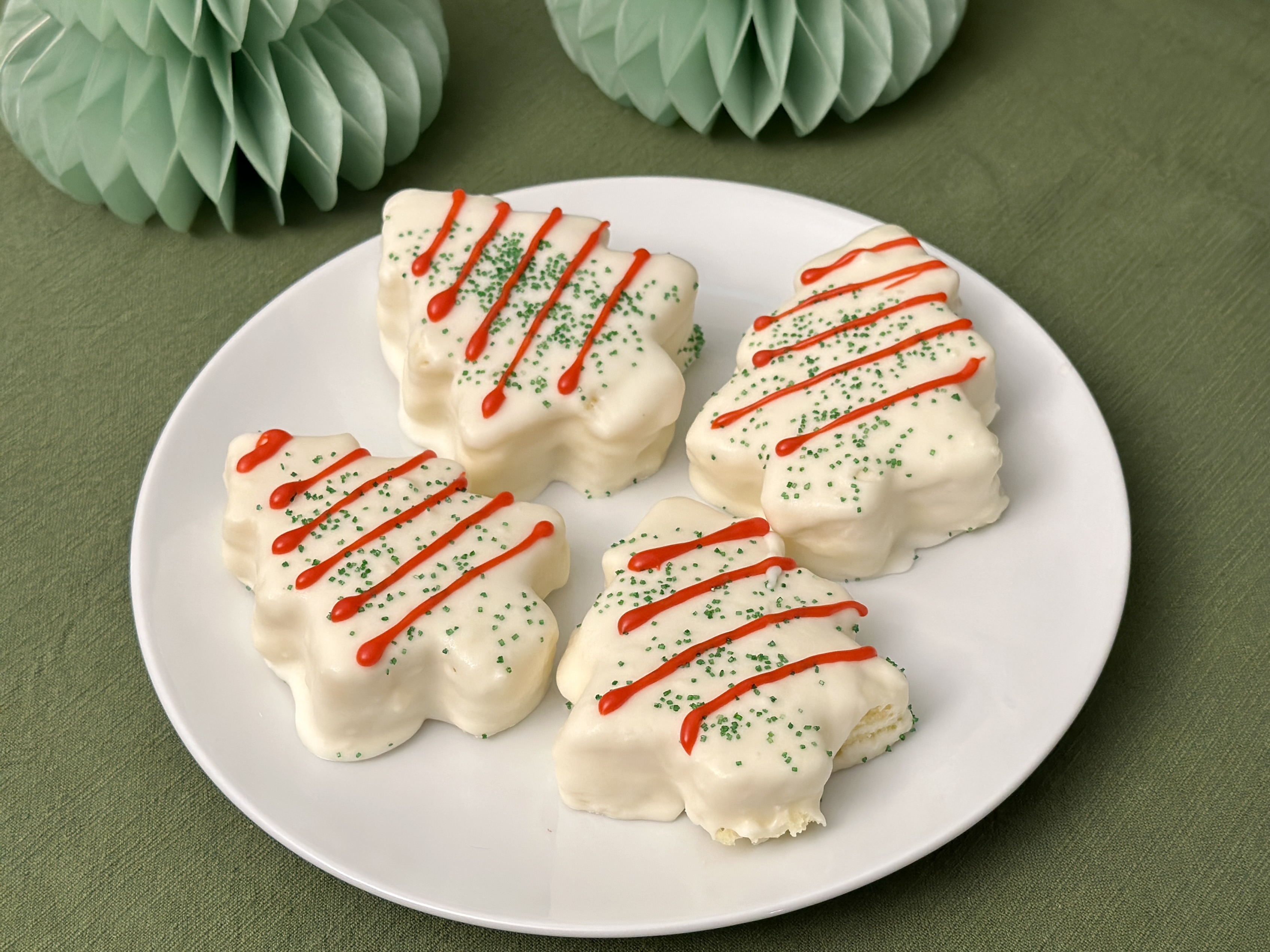11. Pipe the red icing over each cake in a decorative line pattern to resemble Little Debbie Christmas Tree Cakes.