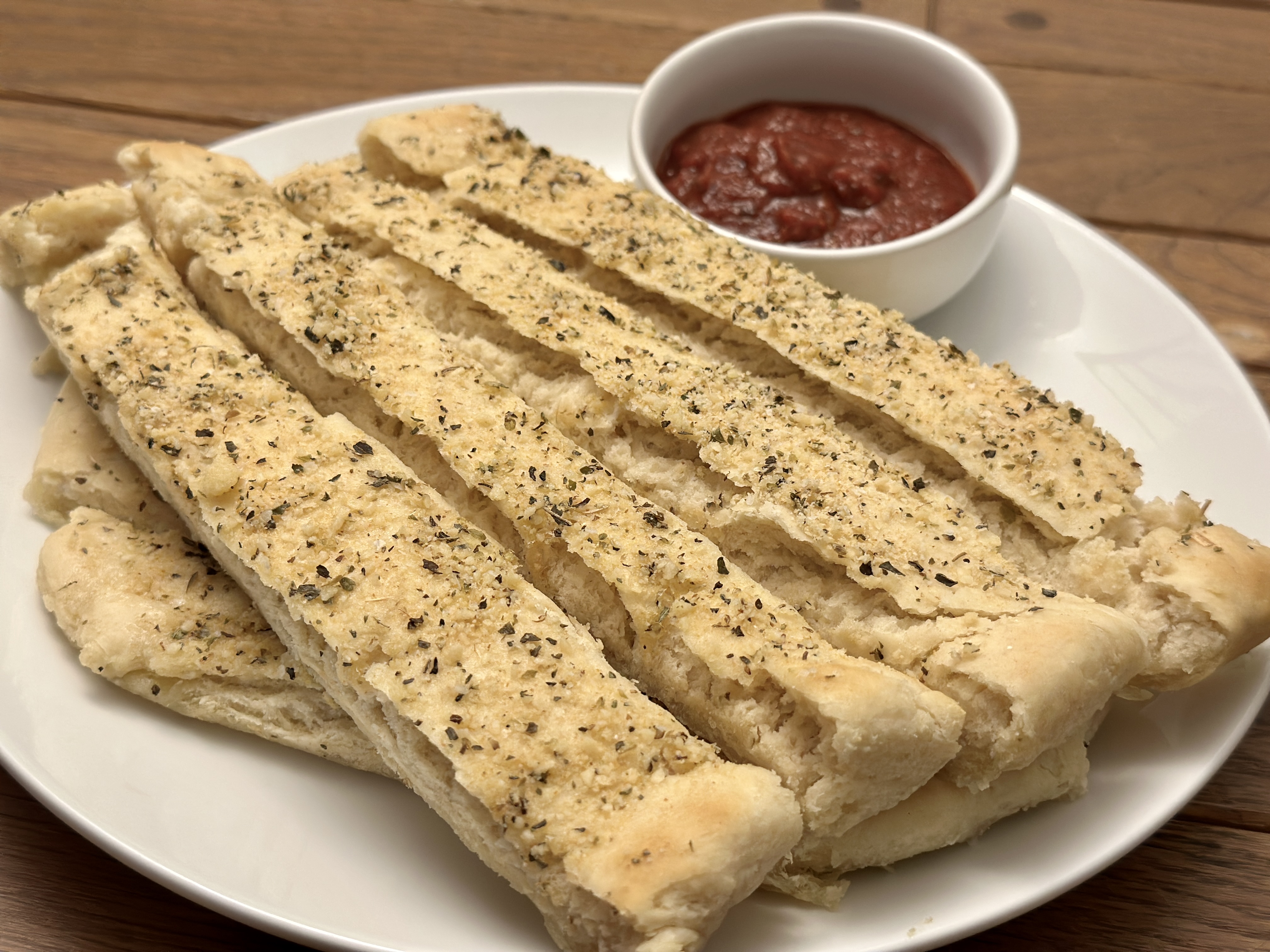 Brush the melted butter over the top of the breadsticks (liberally), then sprinkle with the parmesan mixture. Let sit for about 5 minutes then carefully remove to a cutting board or slice directly in the baking pans. Once the breadsticks are sliced, transfer to a serving platter and serve warm with marinara sauce on the side for dipping. Enjoy!