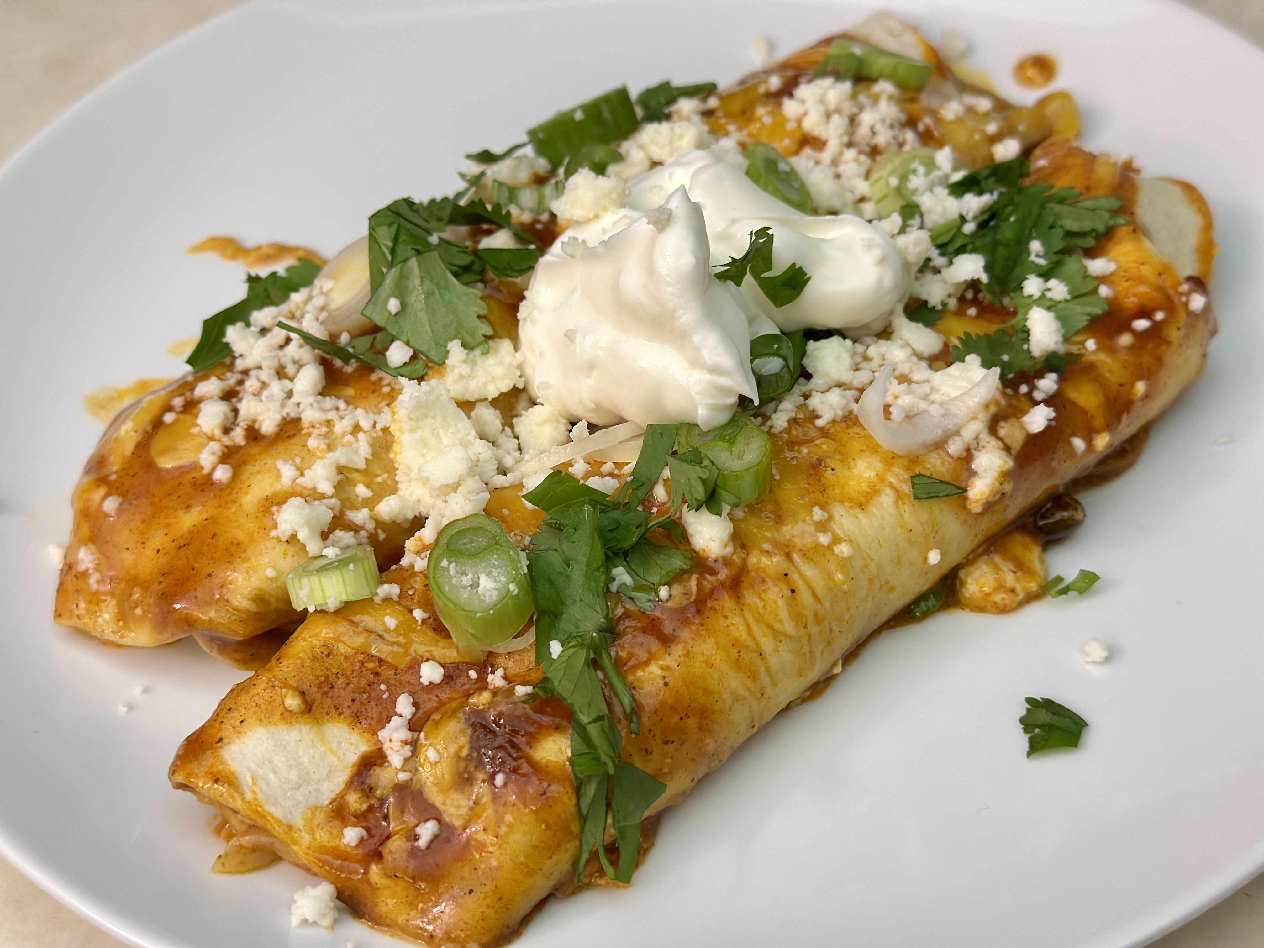 4. Fill each tortilla with a heaping 1/3 cup of the filling, roll up each tortilla, and place seam-side down in the baking dish. You should be able to fit 8 tortillas in the baking dish.