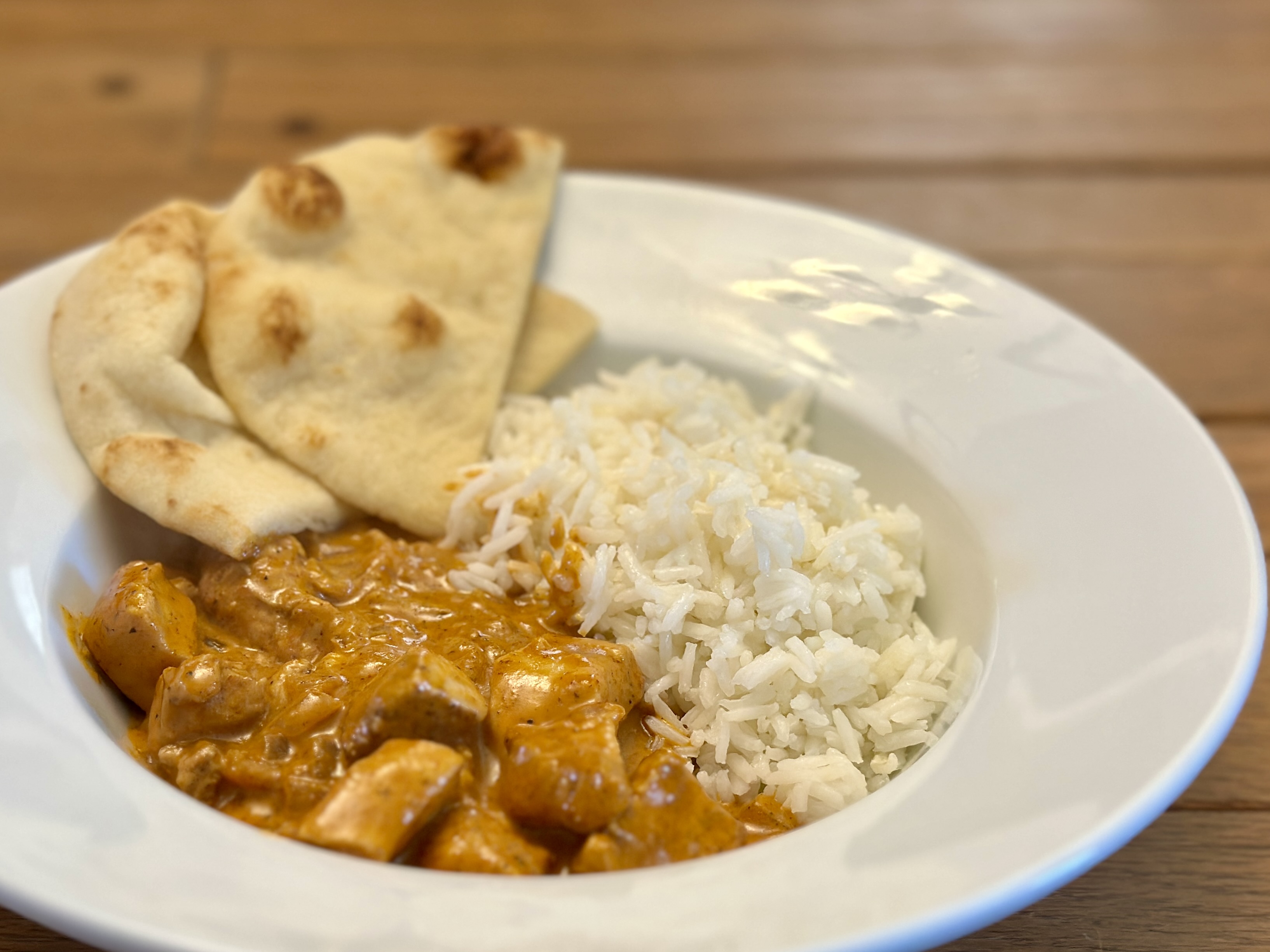Serve the chicken over basmati rice with a side of naan bread. Enjoy!