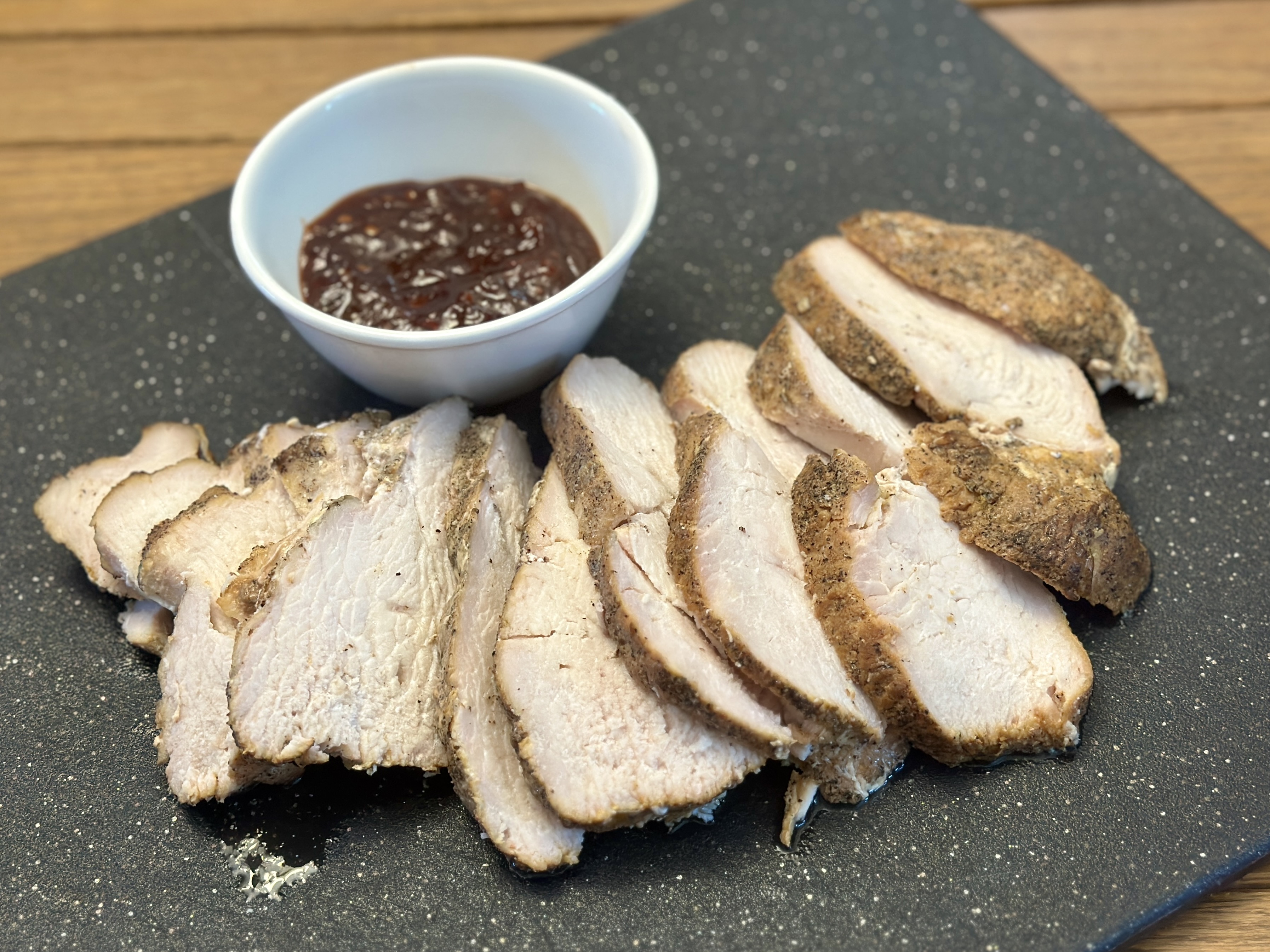 Slice the turkey and transfer to a serving platter. Serve immediately with the sauce on the side for dipping.