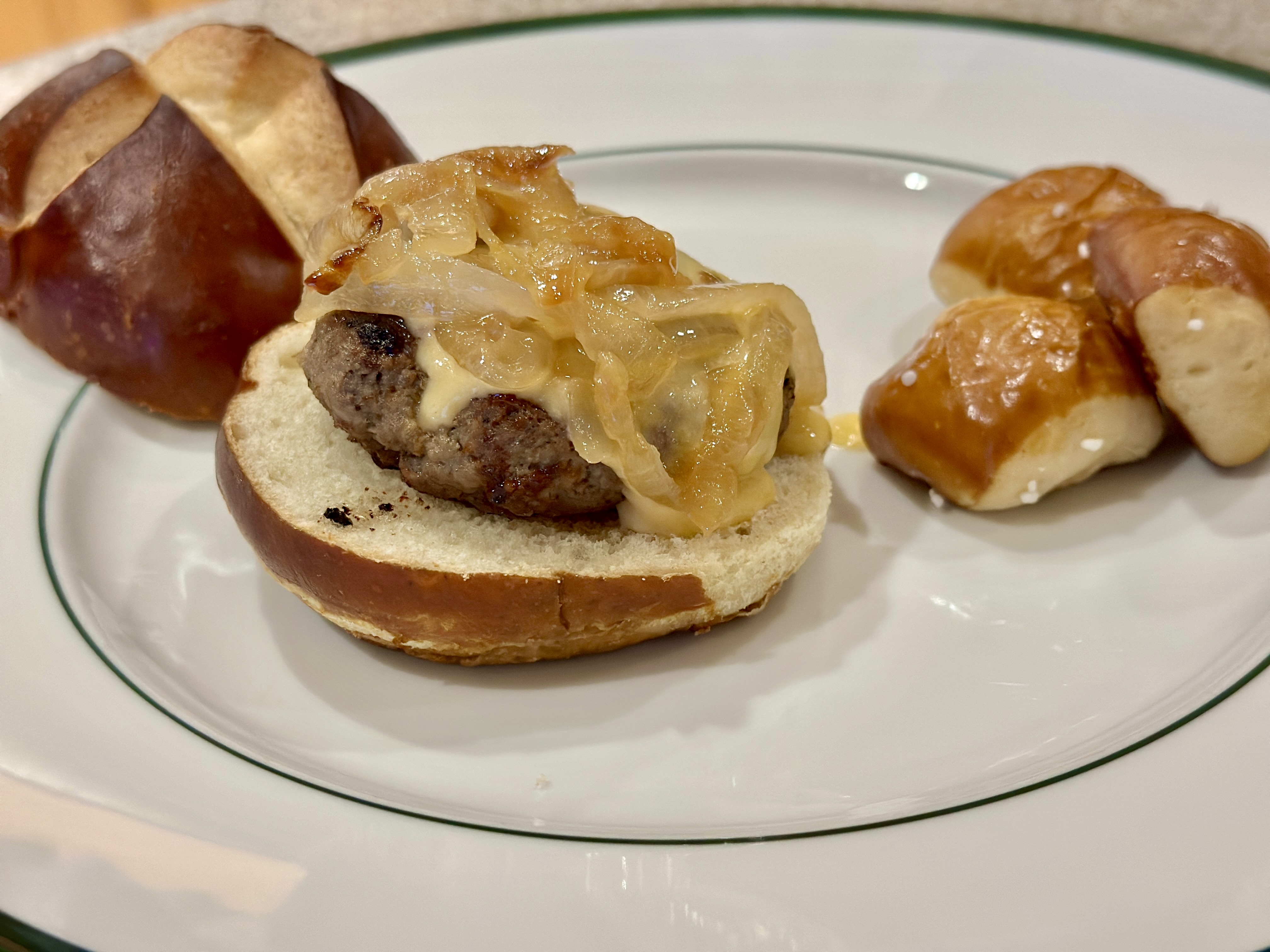 When ready to build your burger, start with the pretzel bun base, add a burger, top with beer cheese, then some caramelized onions. Add the top half of the bun. Serve and enjoy!