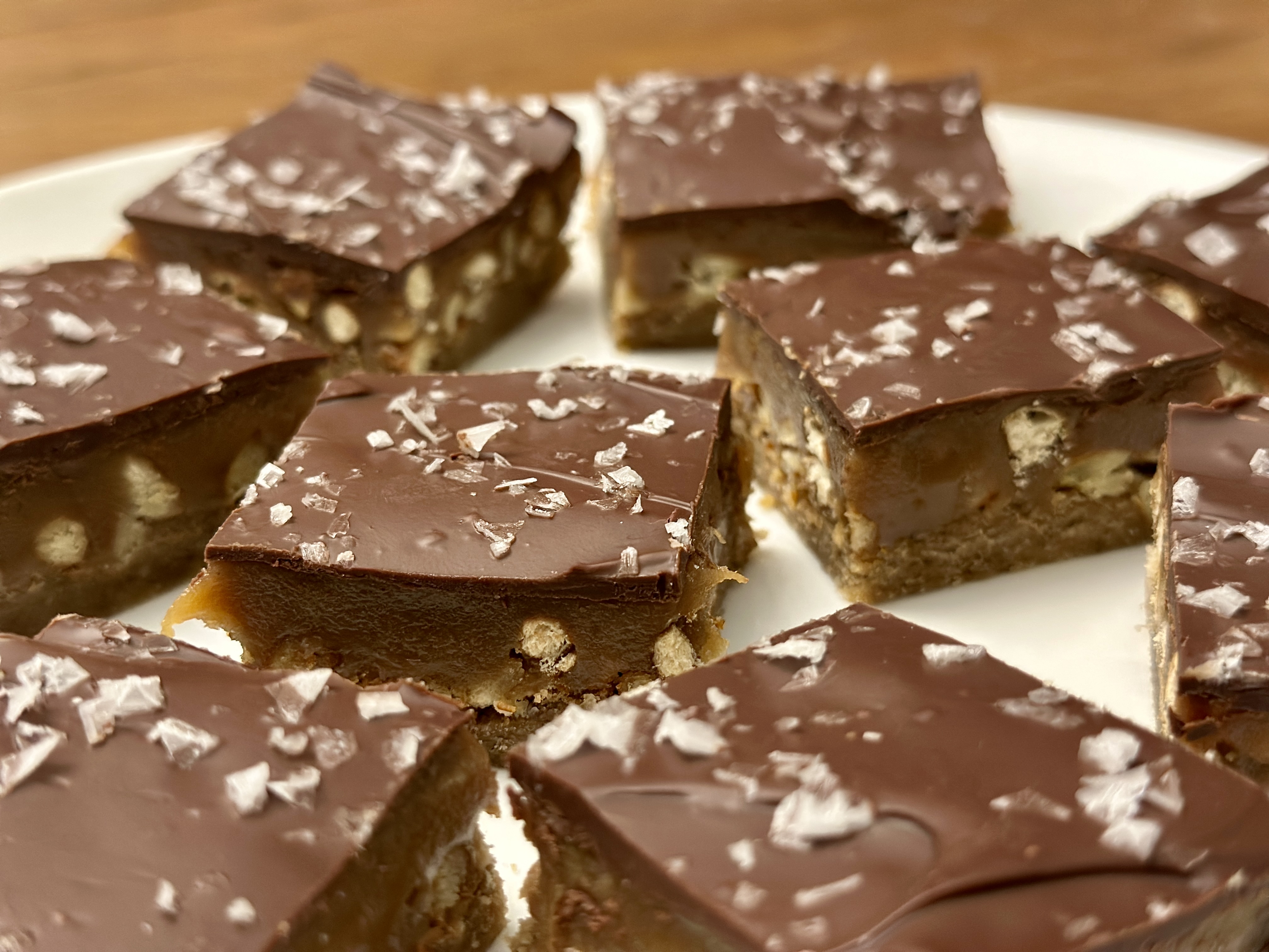 - Add the chocolate chips and coconut oil to a microwave safe bowl. Heat in 30-second increments until melted and smooth. Pour over the cooled caramel and spread into an even layer. Sprinkle with flaky sea salt. P.