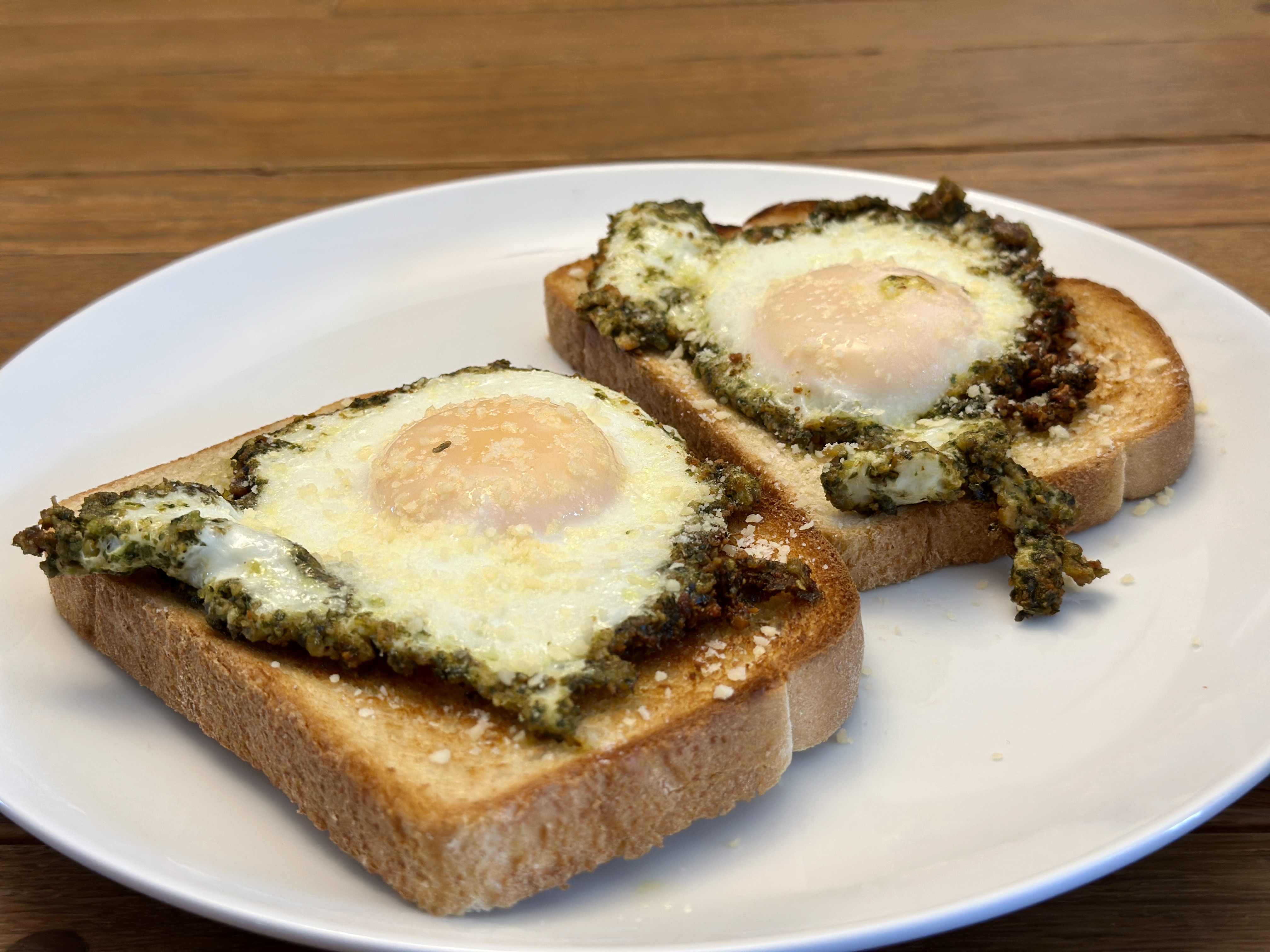- Transfer the toast to plates and top each with one egg. The bottom of each egg will be nicely coated in pesto.