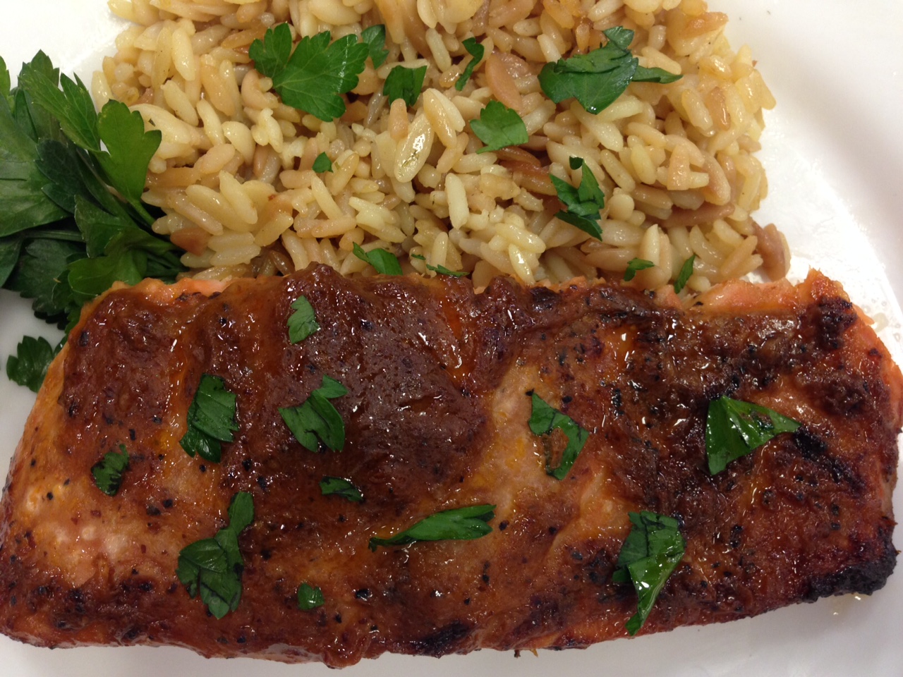2. For the salmon, spray a 9x13-inch baking pan with cooking spray and place salmon filets skin-side down in pan. Sprinkle evenly with salt and pepper and spread cooled marinade/glaze evenly over the top. Cover and place in fridge to marinate 2 to 8 hours.