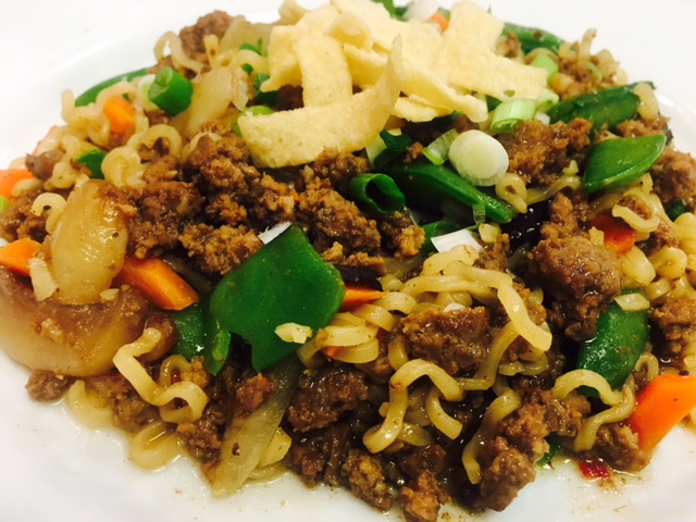 In a large skillet, brown ground beef together with contents of one ramen seasoning packet. Transfer beef to bowl; set aside.