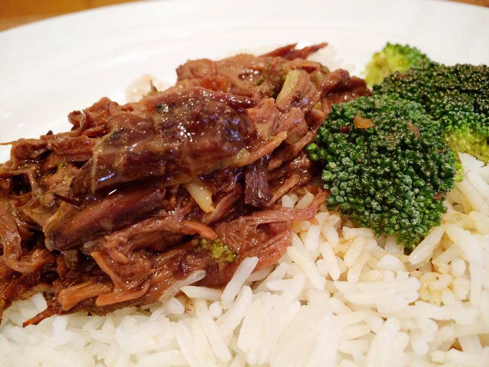 In a small bowl, combine consomme, soy sauce, brown sugar, oil, and garlic. Pour over beef. Cook on low for 6-8 hours.