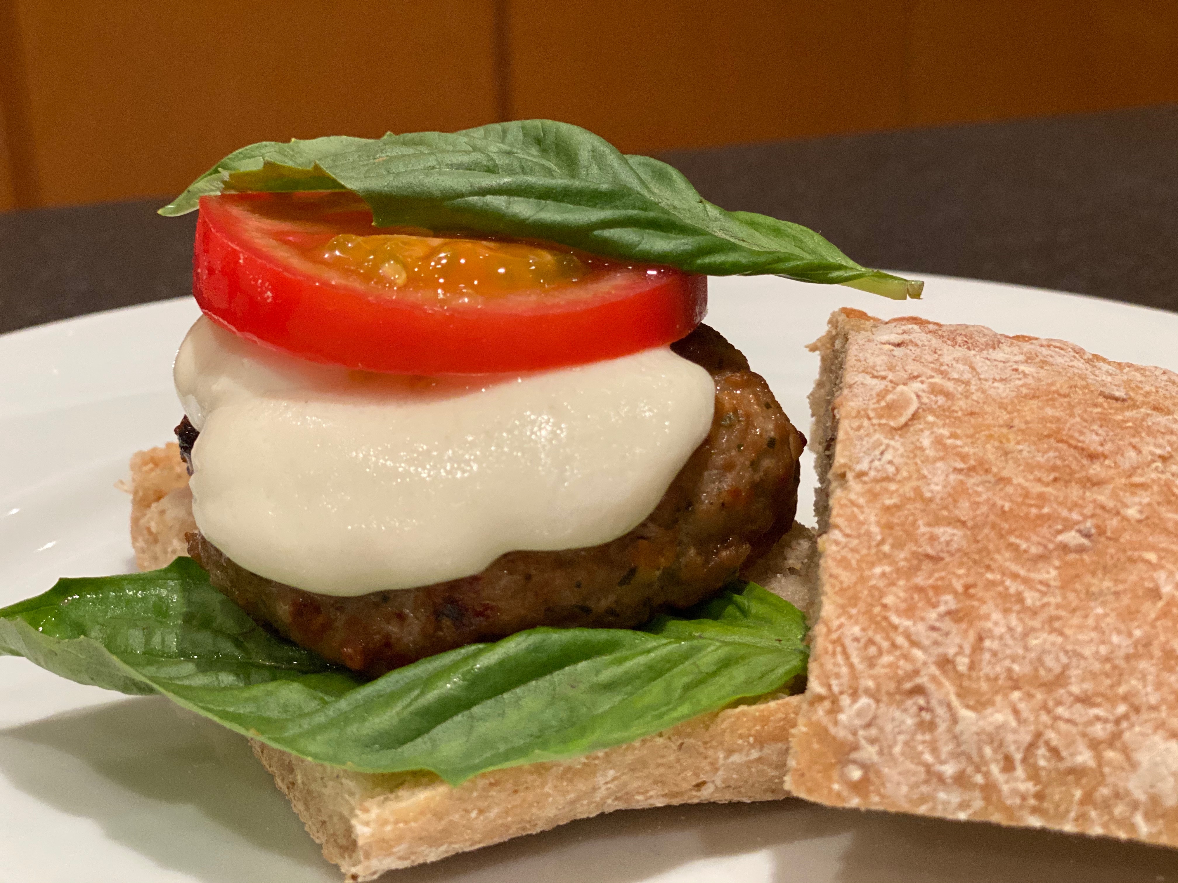 2. Grill patties until thoroughly cooked approximately 12 - 13 minutes turning once. Top each patty with a slice of fresh mozzarella and grill until cheese is melted.