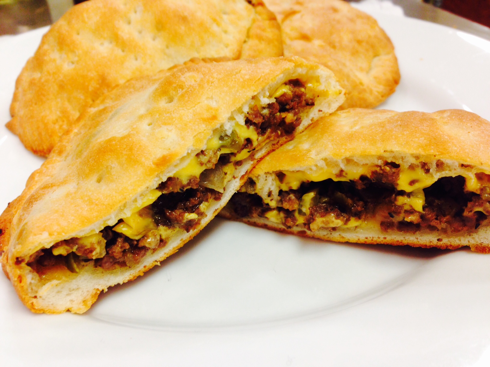 Place 2 biscuits overlapping on floured surface; roll out into 5-inch oval. Place half a slice of American Cheese on bottom of rolled biscuit, top with about 1/4 cup cheeseburger mixture and top with other half of American cheese slice. Fold dough over filling; press edges together with fork to seal. Repeat with the 4 remaining cheeseburger pockets. Place on greased baking sheet; prick tops with fork.