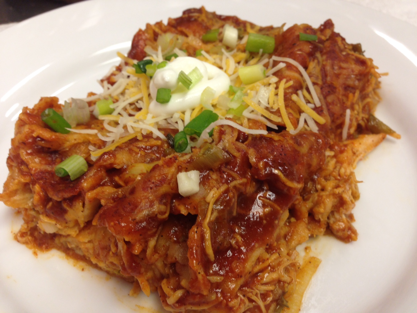 Pour enchilada sauce over the top down the middle and garnish with any left over cheese and top with more green onions. Cover with foil and bake for 20 minutes, remove foil and bake another 10 minutes