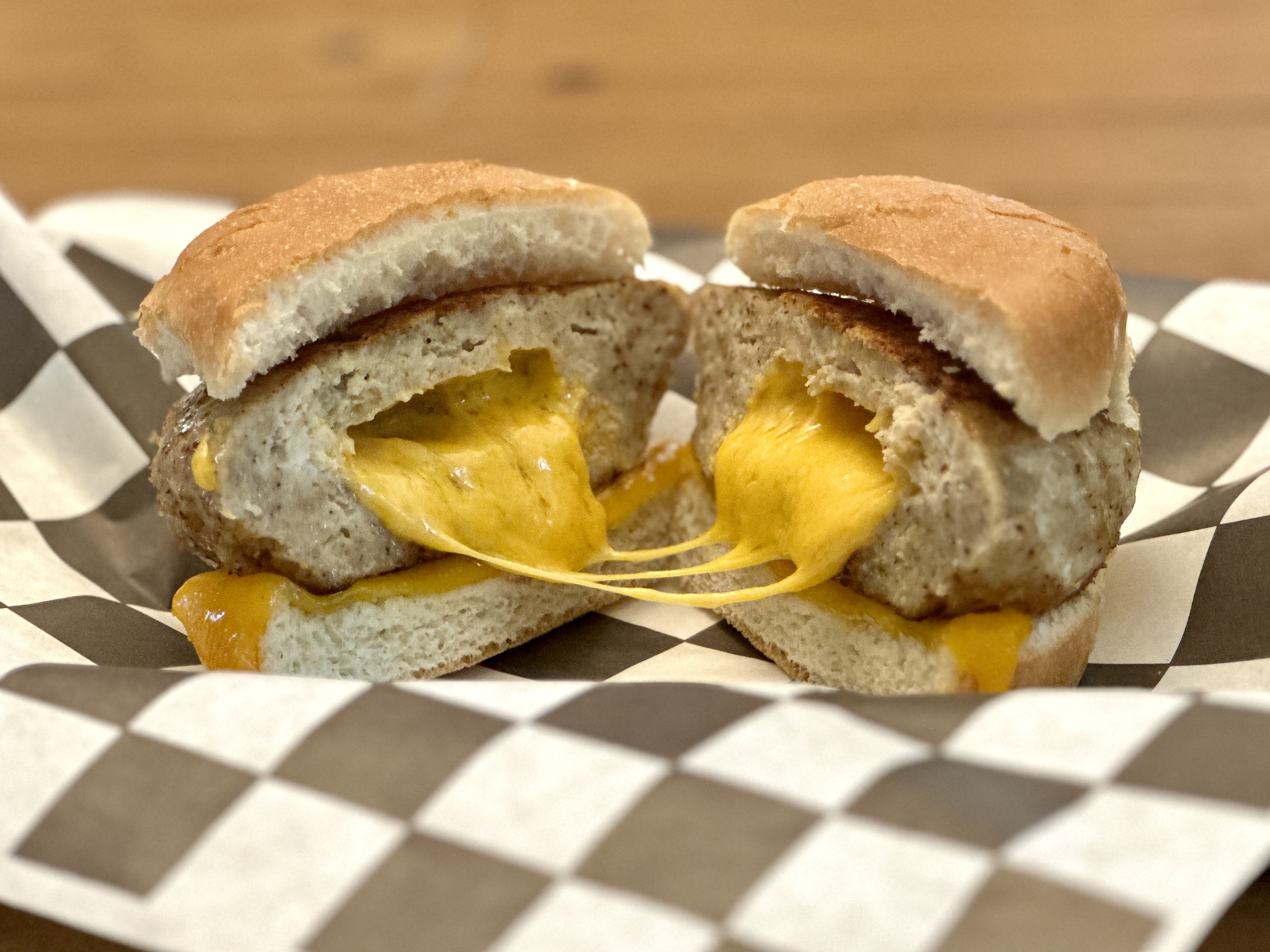Cut each slice of cheese in half and then half again; you should have 4 pieces of cheese. Place a stack of 4 on top of each patty.