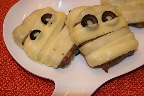 3. Once meatloaf is cooked, place strips of cheese in an overlapping fashion on your slices of meatloaf. Top each slice with black olives for your mummy's eyes. Place back in the oven briefly to melt your cheese to the meatloaf. Keep an eye on it and don't let it melt too much, or you will lose the effect of your mummy's wrap.